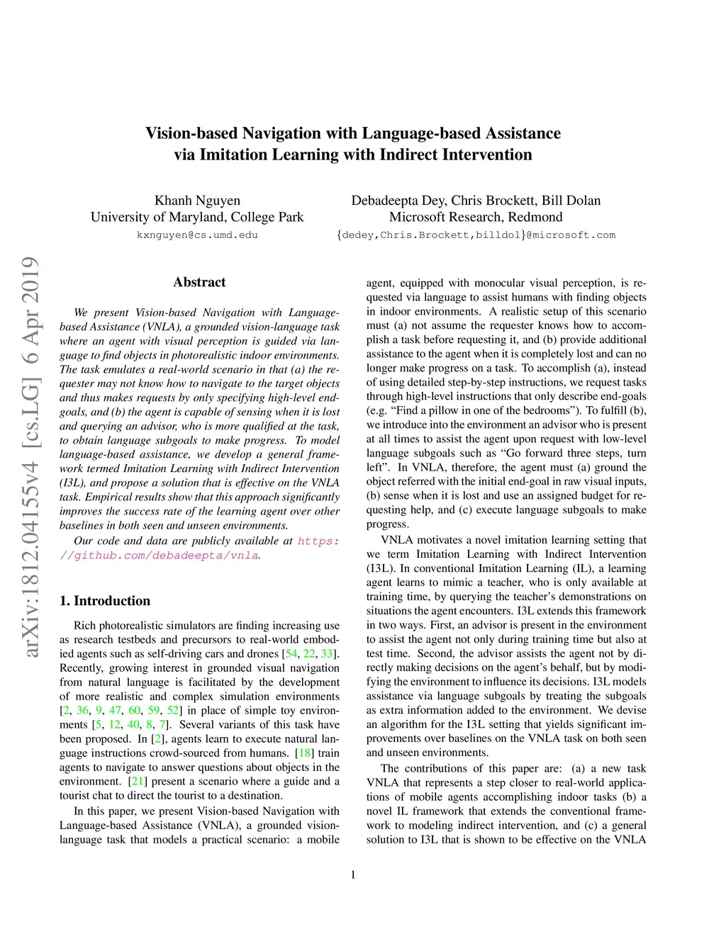 We present Vision-based Navigation with Language-based Assistance (VNLA), a grounded vision-language task where an agent with visual perception is guided via language to find objects in photorealistic indoor environments. The task emulates a real-world scenario in that (a) the requester may not know how to navigate to the target objects and thus makes requests by only specifying high-level end-goals, and (b) the agent is capable of sensing when it is lost and querying an advisor, who is more qualified at the task, to obtain language subgoals to make progress. To model language-based assistance, we develop a general framework termed Imitation Learning with Indirect Intervention (I3L), and propose a solution that is effective on the VNLA task. Empirical results show that this approach significantly improves the success rate of the learning agent over other baselines in both seen and unseen environments. Our code and data are publicly available at https://github.com/debadeepta/vnla .