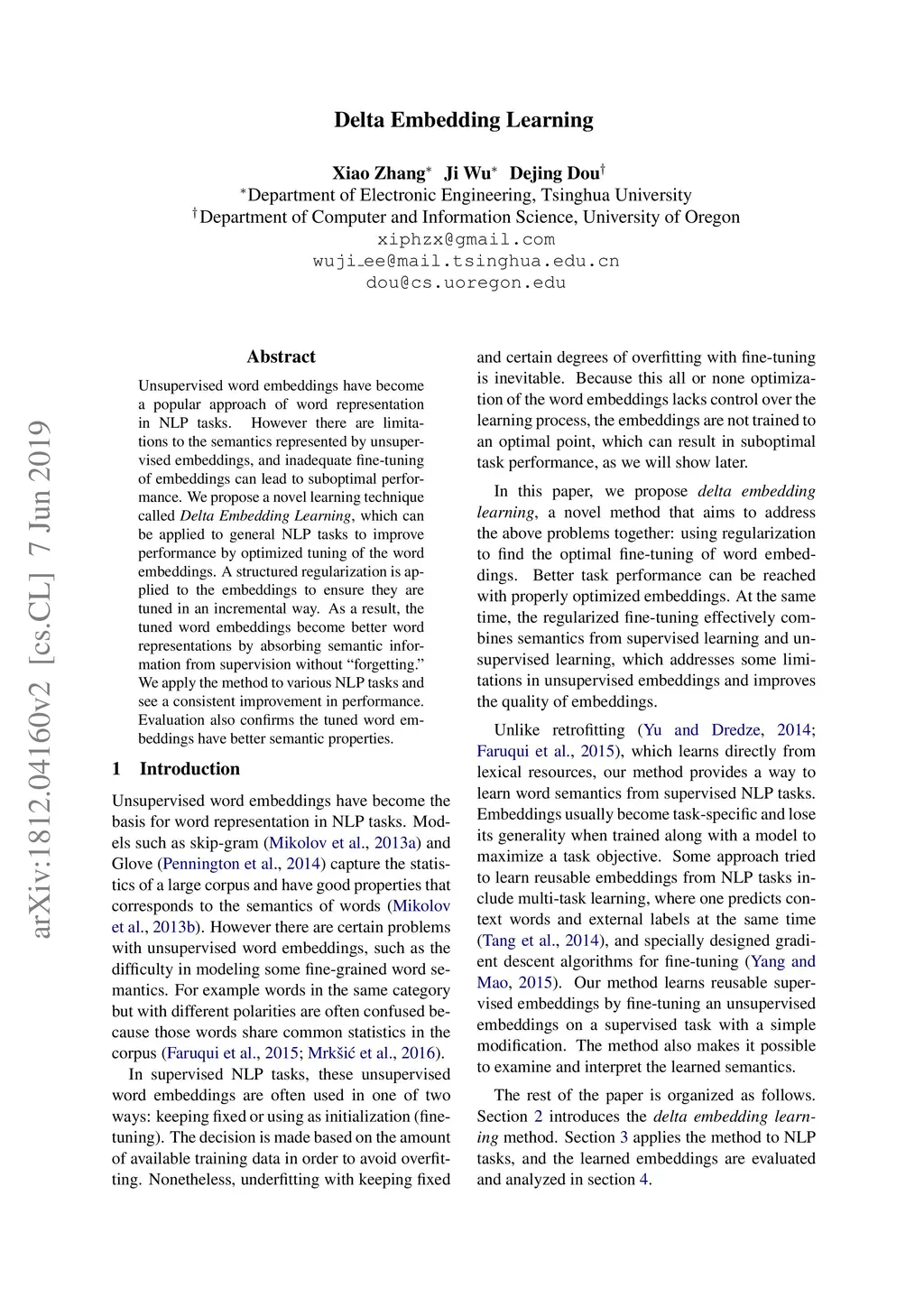 Unsupervised word embeddings have become a popular approach of word representation in NLP tasks. However there are limitations to the semantics represented by unsupervised embeddings, and inadequate fine-tuning of embeddings can lead to suboptimal performance. We propose a novel learning technique called Delta Embedding Learning, which can be applied to general NLP tasks to improve performance by optimized tuning of the word embeddings. A structured regularization is applied to the embeddings to ensure they are tuned in an incremental way. As a result, the tuned word embeddings become better word representations by absorbing semantic information from supervision without "forgetting." We apply the method to various NLP tasks and see a consistent improvement in performance. Evaluation also confirms the tuned word embeddings have better semantic properties.