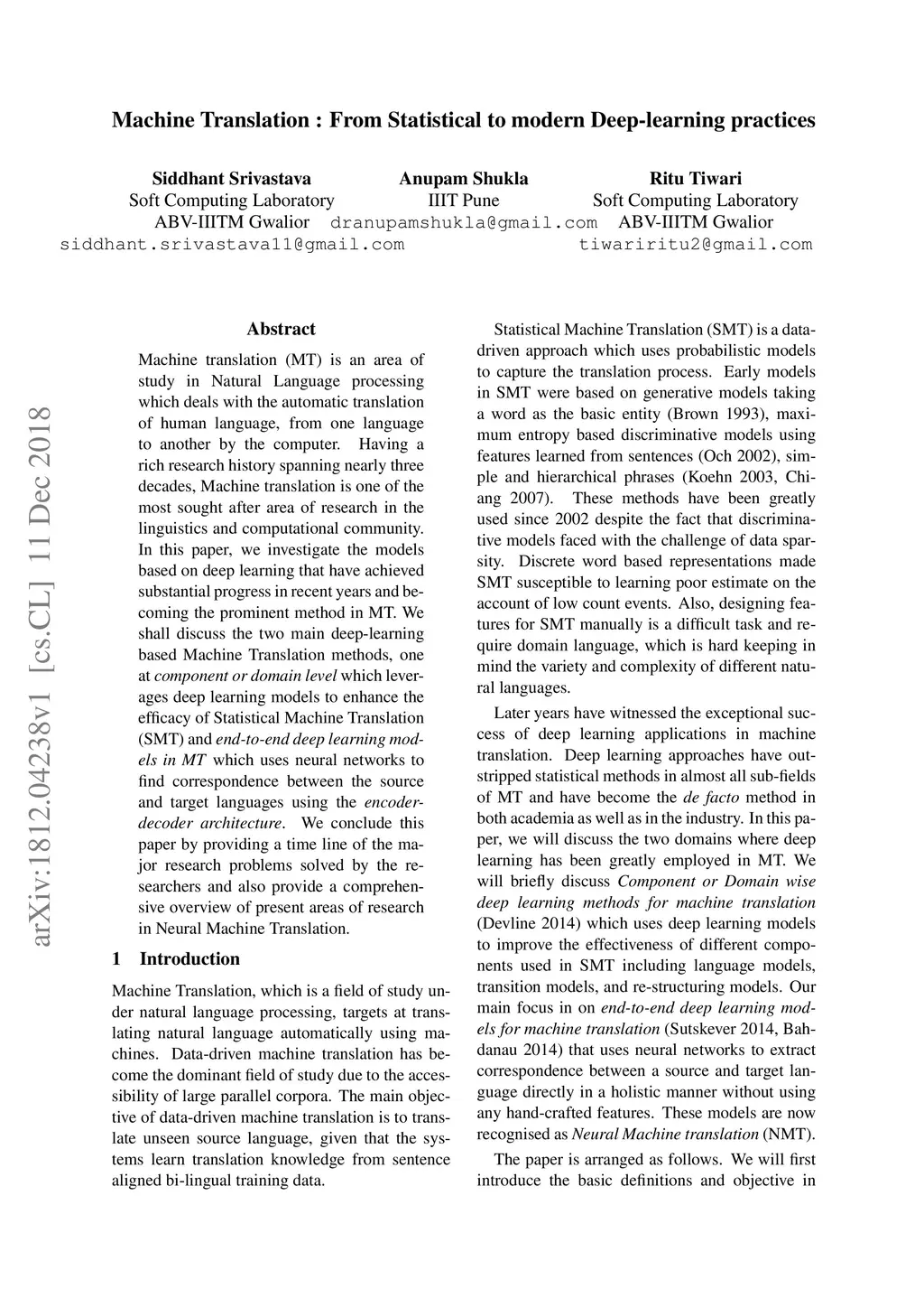 Machine translation (MT) is an area of study in Natural Language processing which deals with the automatic translation of human language, from one language to another by the computer. Having a rich research history spanning nearly three decades, Machine translation is one of the most sought after area of research in the linguistics and computational community. In this paper, we investigate the models based on deep learning that have achieved substantial progress in recent years and becoming the prominent method in MT. We shall discuss the two main deep-learning based Machine Translation methods, one at component or domain level which leverages deep learning models to enhance the efficacy of Statistical Machine Translation (SMT) and end-to-end deep learning models in MT which uses neural networks to find correspondence between the source and target languages using the encoder-decoder architecture. We conclude this paper by providing a time line of the major research problems solved by the researchers and also provide a comprehensive overview of present areas of research in Neural Machine Translation.