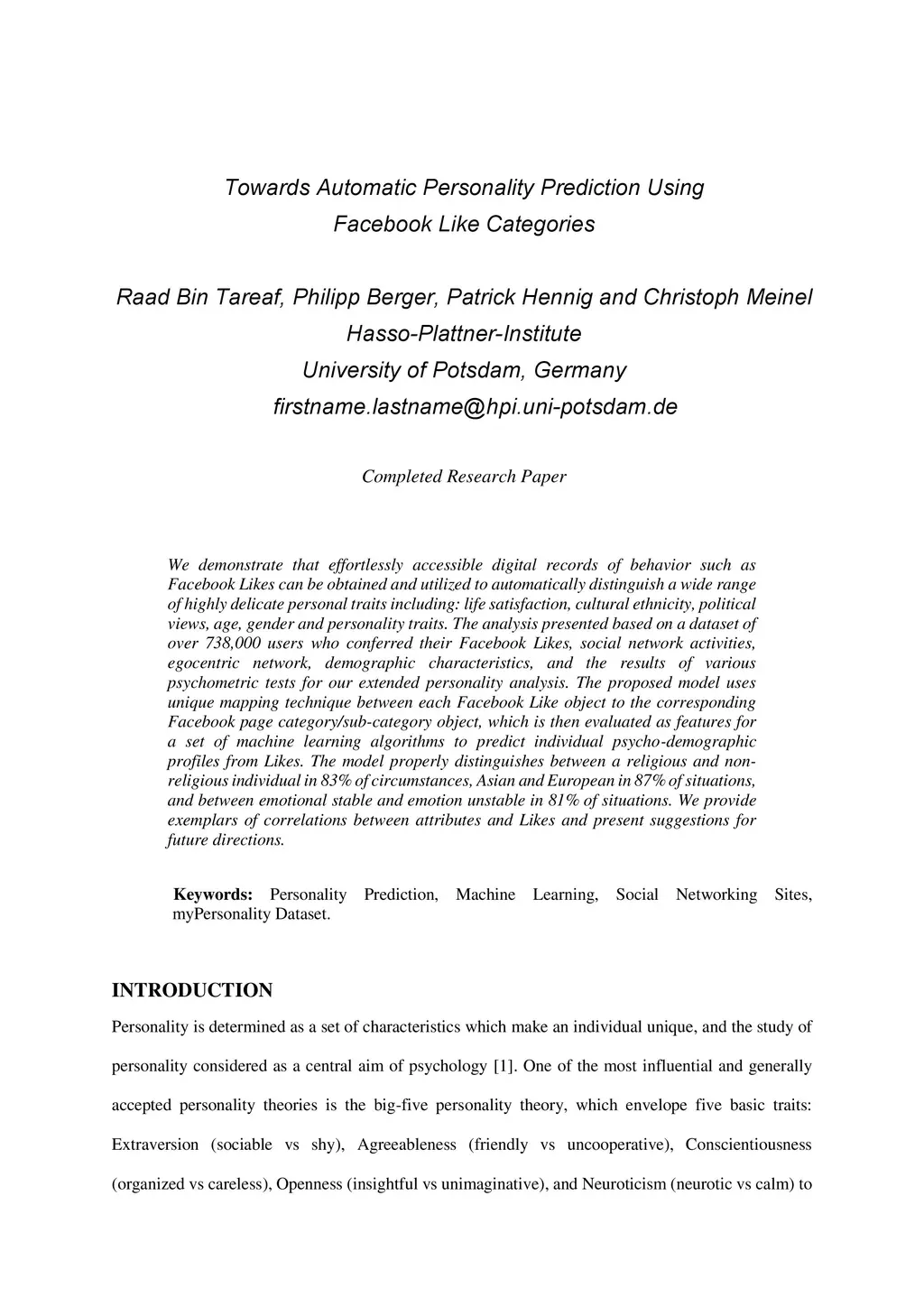 Towards Automatic Personality Prediction Using Facebook Like Categories