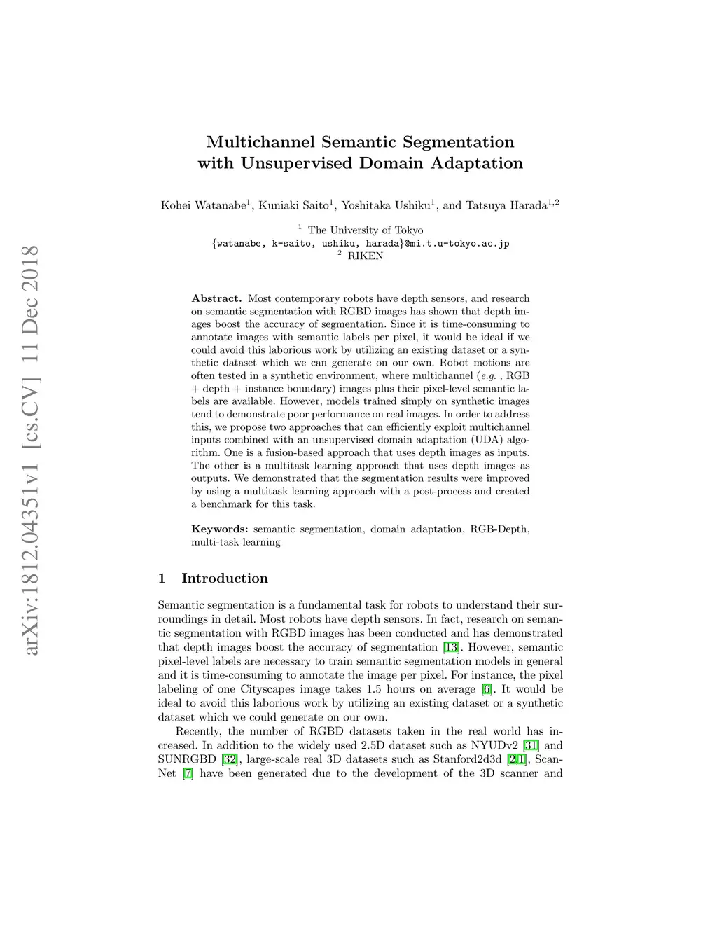 Most contemporary robots have depth sensors, and research on semantic segmentation with RGBD images has shown that depth images boost the accuracy of segmentation. Since it is time-consuming to annotate images with semantic labels per pixel, it would be ideal if we could avoid this laborious work by utilizing an existing dataset or a synthetic dataset which we can generate on our own. Robot motions are often tested in a synthetic environment, where multichannel (eg, RGB + depth + instance boundary) images plus their pixel-level semantic labels are available. However, models trained simply on synthetic images tend to demonstrate poor performance on real images. In order to address this, we propose two approaches that can efficiently exploit multichannel inputs combined with an unsupervised domain adaptation (UDA) algorithm. One is a fusion-based approach that uses depth images as inputs. The other is a multitask learning approach that uses depth images as outputs. We demonstrated that the segmentation results were improved by using a multitask learning approach with a post-process and created a benchmark for this task.