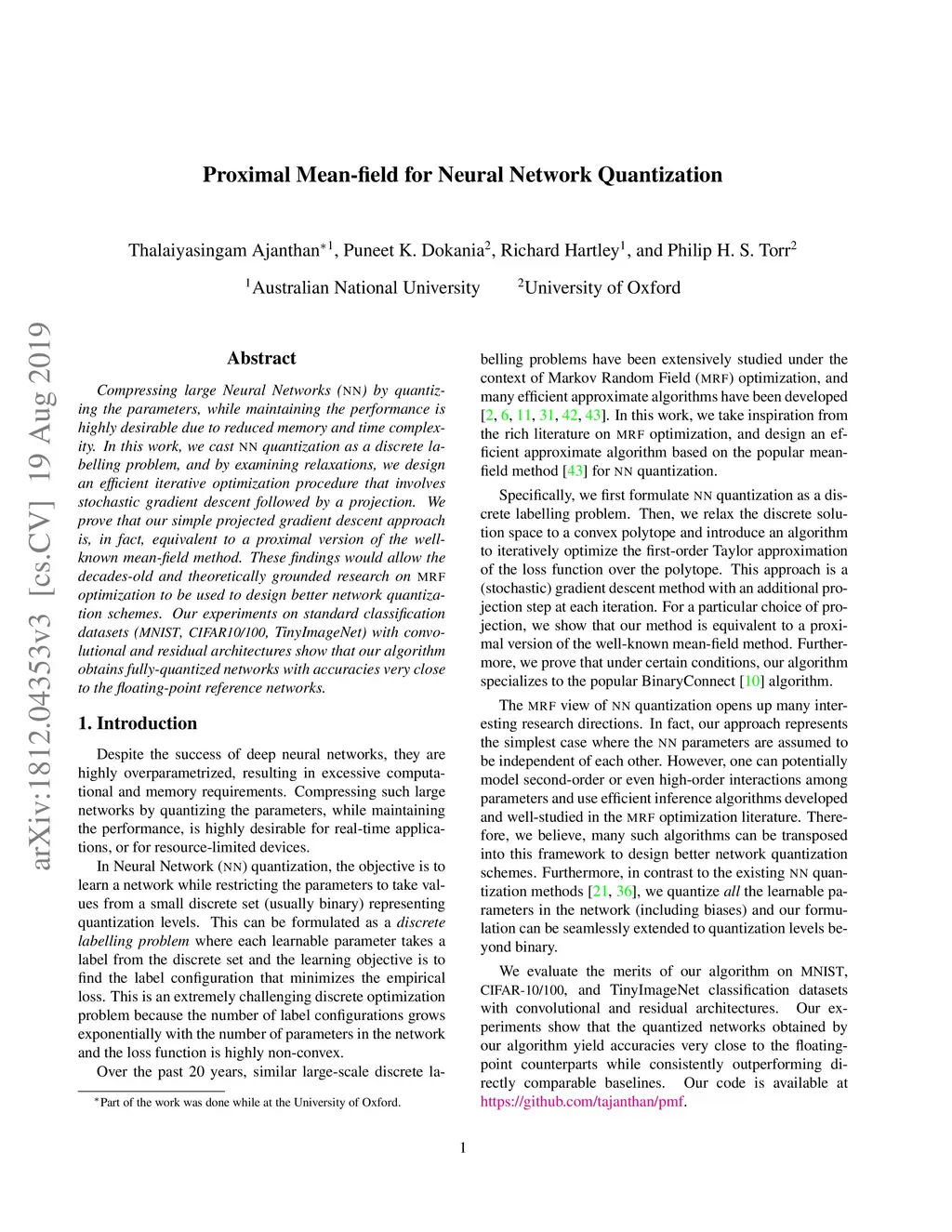 Compressing large Neural Networks (NN) by quantizing the parameters, while maintaining the performance is highly desirable due to reduced memory and time complexity. In this work, we cast NN quantization as a discrete labelling problem, and by examining relaxations, we design an efficient iterative optimization procedure that involves stochastic gradient descent followed by a projection. We prove that our simple projected gradient descent approach is, in fact, equivalent to a proximal version of the well-known mean-field method. These findings would allow the decades-old and theoretically grounded research on MRF optimization to be used to design better network quantization schemes. Our experiments on standard classification datasets (MNIST, CIFAR10/100, TinyImageNet) with convolutional and residual architectures show that our algorithm obtains fully-quantized networks with accuracies very close to the floating-point reference networks.