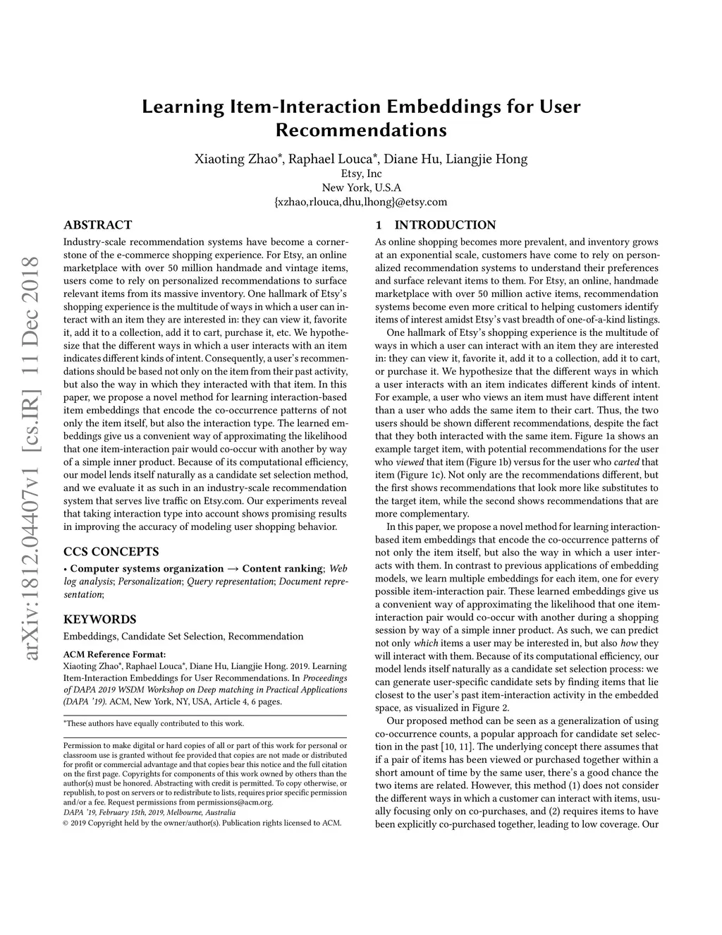 Industry-scale recommendation systems have become a cornerstone of the e-commerce shopping experience. For Etsy, an online marketplace with over 50 million handmade and vintage items, users come to rely on personalized recommendations to surface relevant items from its massive inventory. One hallmark of Etsy's shopping experience is the multitude of ways in which a user can interact with an item they are interested in: they can view it, favorite it, add it to a collection, add it to cart, purchase it, etc. We hypothesize that the different ways in which a user interacts with an item indicates different kinds of intent. Consequently, a user's recommendations should be based not only on the item from their past activity, but also the way in which they interacted with that item. In this paper, we propose a novel method for learning interaction-based item embeddings that encode the co-occurrence patterns of not only the item itself, but also the interaction type. The learned embeddings give us a convenient way of approximating the likelihood that one item-interaction pair would co-occur with another by way of a simple inner product. Because of its computational efficiency, our model lends itself naturally as a candidate set selection method, and we evaluate it as such in an industry-scale recommendation system that serves live traffic on Etsy.com. Our experiments reveal that taking interaction type into account shows promising results in improving the accuracy of modeling user shopping behavior.