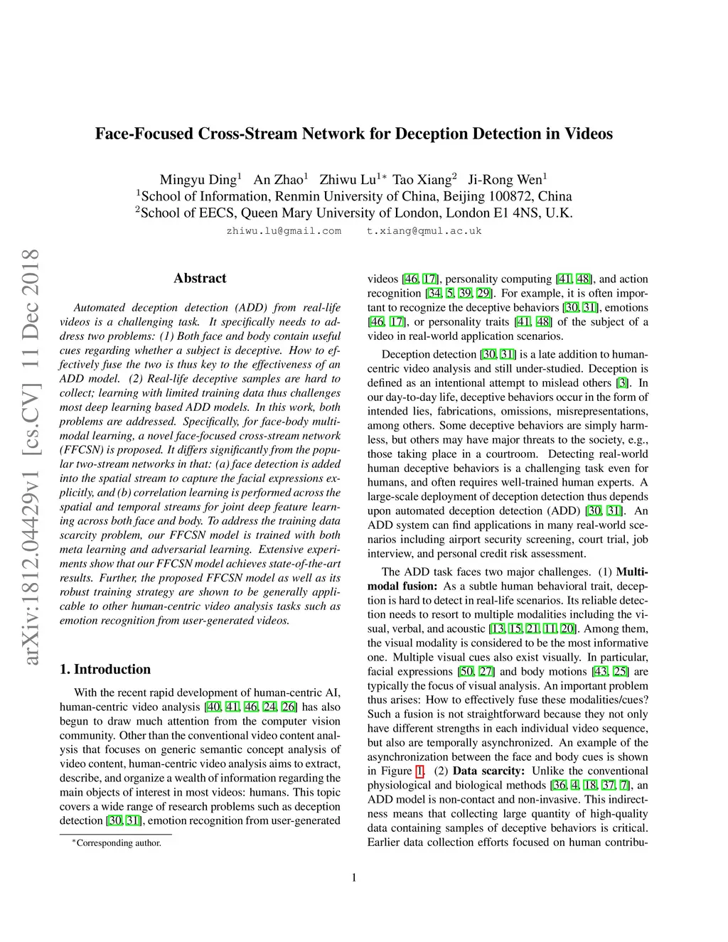 Automated deception detection (ADD) from real-life videos is a challenging task. It specifically needs to address two problems: (1) Both face and body contain useful cues regarding whether a subject is deceptive. How to effectively fuse the two is thus key to the effectiveness of an ADD model. (2) Real-life deceptive samples are hard to collect; learning with limited training data thus challenges most deep learning based ADD models. In this work, both problems are addressed. Specifically, for face-body multimodal learning, a novel face-focused cross-stream network (FFCSN) is proposed. It differs significantly from the popular two-stream networks in that: (a) face detection is added into the spatial stream to capture the facial expressions explicitly, and (b) correlation learning is performed across the spatial and temporal streams for joint deep feature learning across both face and body. To address the training data scarcity problem, our FFCSN model is trained with both meta learning and adversarial learning. Extensive experiments show that our FFCSN model achieves state-of-the-art results. Further, the proposed FFCSN model as well as its robust training strategy are shown to be generally applicable to other human-centric video analysis tasks such as emotion recognition from user-generated videos.