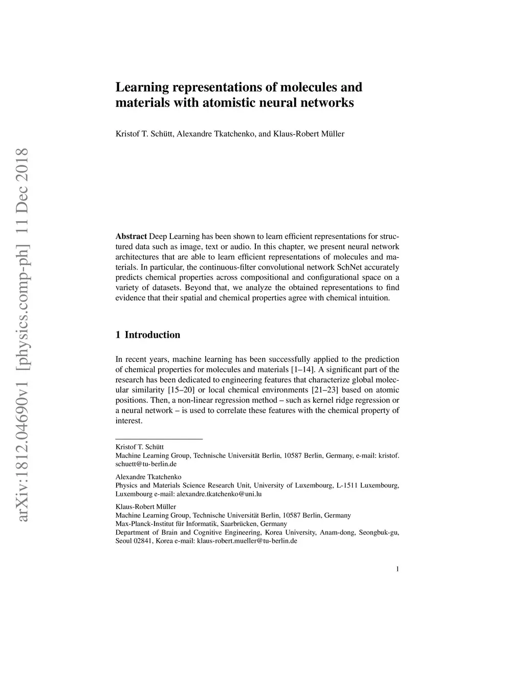 Deep Learning has been shown to learn efficient representations for structured data such as image, text or audio. In this chapter, we present neural network architectures that are able to learn efficient representations of molecules and materials. In particular, the continuous-filter convolutional network SchNet accurately predicts chemical properties across compositional and configurational space on a variety of datasets. Beyond that, we analyze the obtained representations to find evidence that their spatial and chemical properties agree with chemical intuition.