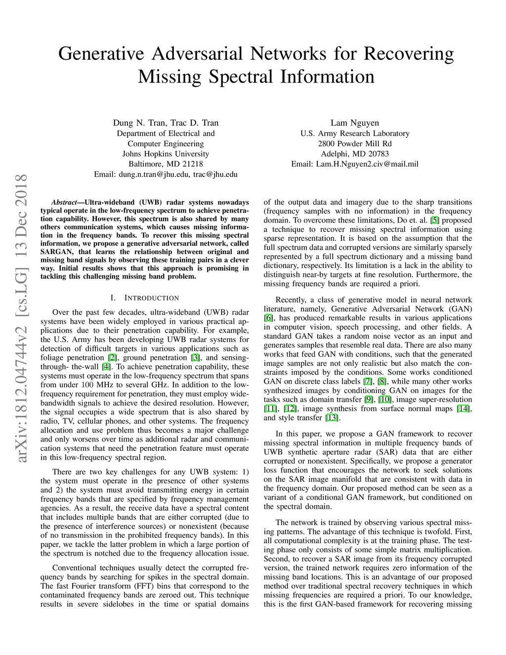 Ultra-wideband (UWB) radar systems nowadays typical operate in the low frequency spectrum to achieve penetration capability. However, this spectrum is also shared by many others communication systems, which causes missing information in the frequency bands. To recover this missing spectral information, we propose a generative adversarial network, called SARGAN, that learns the relationship between original and missing band signals by observing these training pairs in a clever way. Initial results shows that this approach is promising in tackling this challenging missing band problem.
