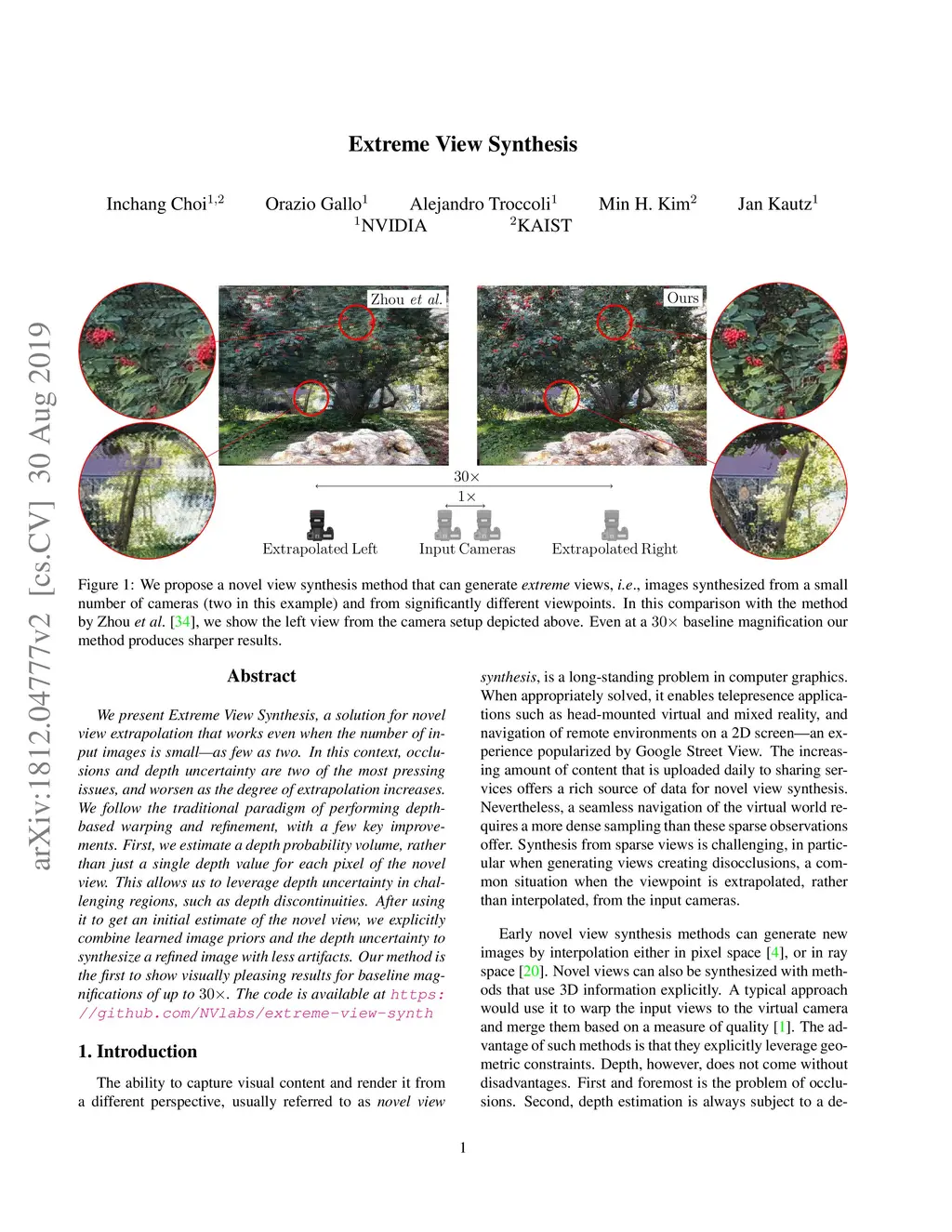 We present Extreme View Synthesis, a solution for novel view extrapolation that works even when the number of input images is small--as few as two. In this context, occlusions and depth uncertainty are two of the most pressing issues, and worsen as the degree of extrapolation increases. We follow the traditional paradigm of performing depth-based warping and refinement, with a few key improvements. First, we estimate a depth probability volume, rather than just a single depth value for each pixel of the novel view. This allows us to leverage depth uncertainty in challenging regions, such as depth discontinuities. After using it to get an initial estimate of the novel view, we explicitly combine learned image priors and the depth uncertainty to synthesize a refined image with less artifacts. Our method is the first to show visually pleasing results for baseline magnifications of up to 30X.