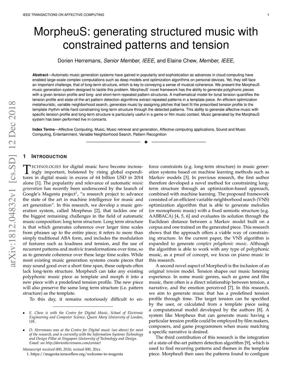 Automatic music generation systems have gained in popularity and sophistication as advances in cloud computing have enabled large-scale complex computations such as deep models and optimization algorithms on personal devices. Yet, they still face an important challenge, that of long-term structure, which is key to conveying a sense of musical coherence. We present the MorpheuS music generation system designed to tackle this problem. MorpheuS' novel framework has the ability to generate polyphonic pieces with a given tension profile and long- and short-term repeated pattern structures. A mathematical model for tonal tension quantifies the tension profile and state-of-the-art pattern detection algorithms extract repeated patterns in a template piece. An efficient optimization metaheuristic, variable neighborhood search, generates music by assigning pitches that best fit the prescribed tension profile to the template rhythm while hard constraining long-term structure through the detected patterns. This ability to generate affective music with specific tension profile and long-term structure is particularly useful in a game or film music context. Music generated by the MorpheuS system has been performed live in concerts.