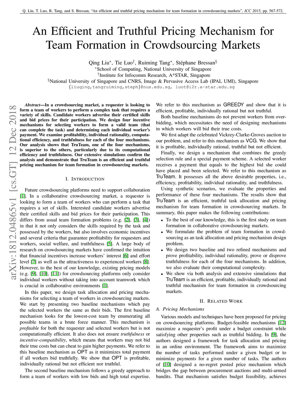In a crowdsourcing market, a requester is looking to form a team of workers to perform a complex task that requires a variety of skills. Candidate workers advertise their certified skills and bid prices for their participation. We design four incentive mechanisms for selecting workers to form a valid team (that can complete the task) and determining each individual worker's payment. We examine profitability, individual rationality, computational efficiency, and truthfulness for each of the four mechanisms. Our analysis shows that TruTeam, one of the four mechanisms, is superior to the others, particularly due to its computational efficiency and truthfulness. Our extensive simulations confirm the analysis and demonstrate that TruTeam is an efficient and truthful pricing mechanism for team formation in crowdsourcing markets.