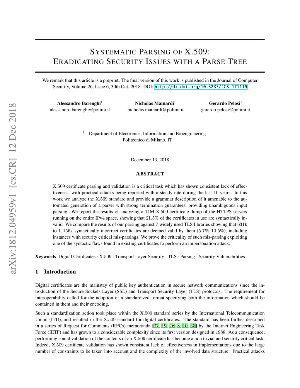 X.509 certificate parsing and validation is a critical task which has shown consistent lack of effectiveness, with practical attacks being reported with a steady rate during the last 10 years. In this work we analyze the X.509 standard and provide a grammar description of it amenable to the automated generation of a parser with strong termination guarantees, providing unambiguous input parsing. We report the results of analyzing a 11M X.509 certificate dump of the HTTPS servers running on the entire IPv4 space, showing that 21.5% of the certificates in use are syntactically invalid. We compare the results of our parsing against 7 widely used TLS libraries showing that 631k to 1,156k syntactically incorrect certificates are deemed valid by them (5.7%--10.5%), including instances with security critical mis-parsings. We prove the criticality of such mis-parsing exploiting one of the syntactic flaws found in existing certificates to perform an impersonation attack.