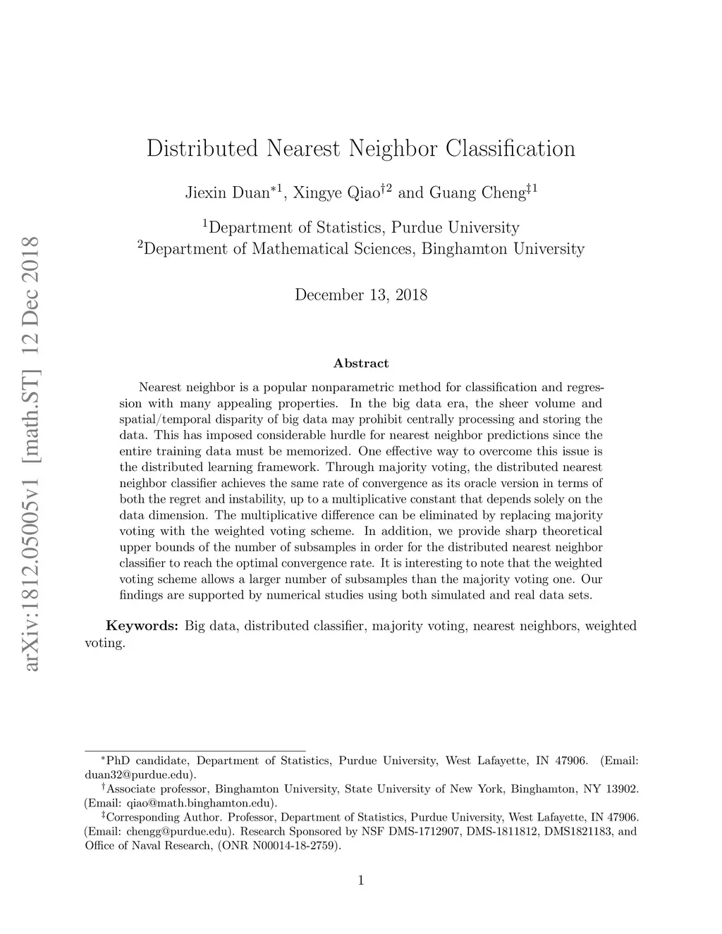 Nearest neighbor is a popular nonparametric method for classification and regression with many appealing properties. In the big data era, the sheer volume and spatial/temporal disparity of big data may prohibit centrally processing and storing the data. This has imposed considerable hurdle for nearest neighbor predictions since the entire training data must be memorized. One effective way to overcome this issue is the distributed learning framework. Through majority voting, the distributed nearest neighbor classifier achieves the same rate of convergence as its oracle version in terms of both the regret and instability, up to a multiplicative constant that depends solely on the data dimension. The multiplicative difference can be eliminated by replacing majority voting with the weighted voting scheme. In addition, we provide sharp theoretical upper bounds of the number of subsamples in order for the distributed nearest neighbor classifier to reach the optimal convergence rate. It is interesting to note that the weighted voting scheme allows a larger number of subsamples than the majority voting one. Our findings are supported by numerical studies using both simulated and real data sets.