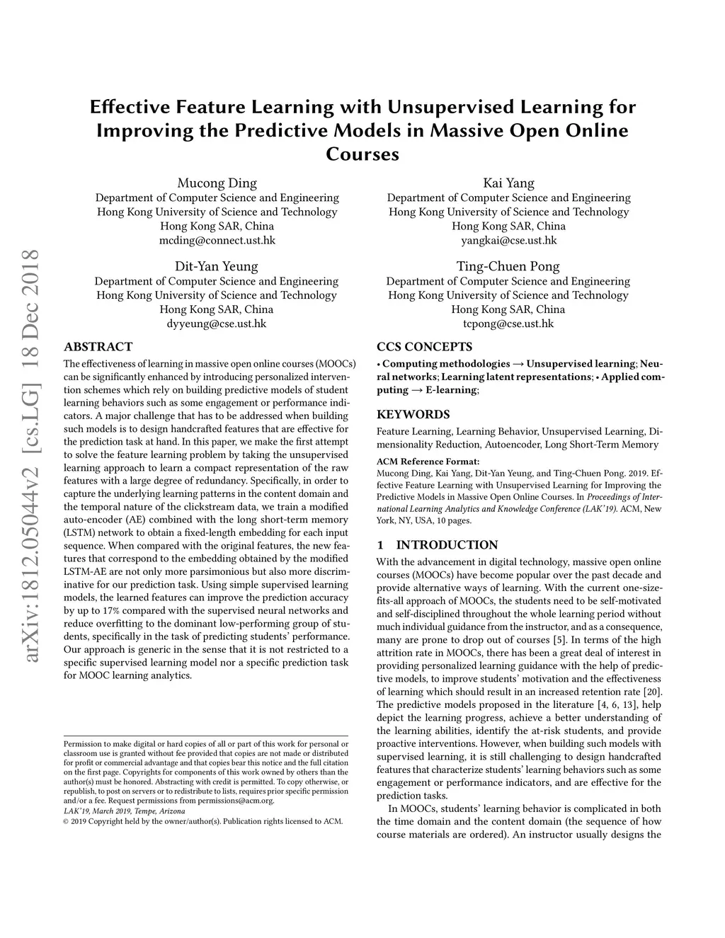 The effectiveness of learning in massive open online courses (MOOCs) can be significantly enhanced by introducing personalized intervention schemes which rely on building predictive models of student learning behaviors such as some engagement or performance indicators. A major challenge that has to be addressed when building such models is to design handcrafted features that are effective for the prediction task at hand. In this paper, we make the first attempt to solve the feature learning problem by taking the unsupervised learning approach to learn a compact representation of the raw features with a large degree of redundancy. Specifically, in order to capture the underlying learning patterns in the content domain and the temporal nature of the clickstream data, we train a modified auto-encoder (AE) combined with the long short-term memory (LSTM) network to obtain a fixed-length embedding for each input sequence. When compared with the original features, the new features that correspond to the embedding obtained by the modified LSTM-AE are not only more parsimonious but also more discriminative for our prediction task. Using simple supervised learning models, the learned features can improve the prediction accuracy by up to 17% compared with the supervised neural networks and reduce overfitting to the dominant low-performing group of students, specifically in the task of predicting students' performance. Our approach is generic in the sense that it is not restricted to a specific supervised learning model nor a specific prediction task for MOOC learning analytics.