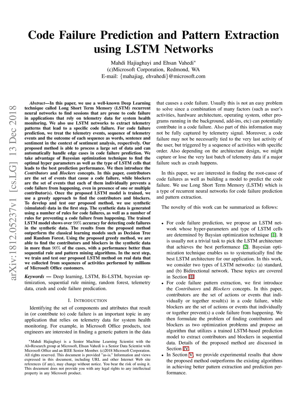 In this paper, we use a well-known Deep Learning technique called Long Short Term Memory (LSTM) recurrent neural networks to find sessions that are prone to code failure in applications that rely on telemetry data for system health monitoring. We also use LSTM networks to extract telemetry patterns that lead to a specific code failure. For code failure prediction, we treat the telemetry events, sequence of telemetry events and the outcome of each sequence as words, sentence and sentiment in the context of sentiment analysis, respectively. Our proposed method is able to process a large set of data and can automatically handle edge cases in code failure prediction. We take advantage of Bayesian optimization technique to find the optimal hyper parameters as well as the type of LSTM cells that leads to the best prediction performance. We then introduce the Contributors and Blockers concepts. In this paper, contributors are the set of events that cause a code failure, while blockers are the set of events that each of them individually prevents a code failure from happening, even in presence of one or multiple contributor(s). Once the proposed LSTM model is trained, we use a greedy approach to find the contributors and blockers. To develop and test our proposed method, we use synthetic (simulated) data in the first step. The synthetic data is generated using a number of rules for code failures, as well as a number of rules for preventing a code failure from happening. The trained LSTM model shows over 99% accuracy for detecting code failures in the synthetic data. The results from the proposed method outperform the classical learning models such as Decision Tree and Random Forest. Using the proposed greedy method, we are able to find the contributors and blockers in the synthetic data in more than 90% of the cases, with a performance better than sequential rule and pattern mining algorithms.