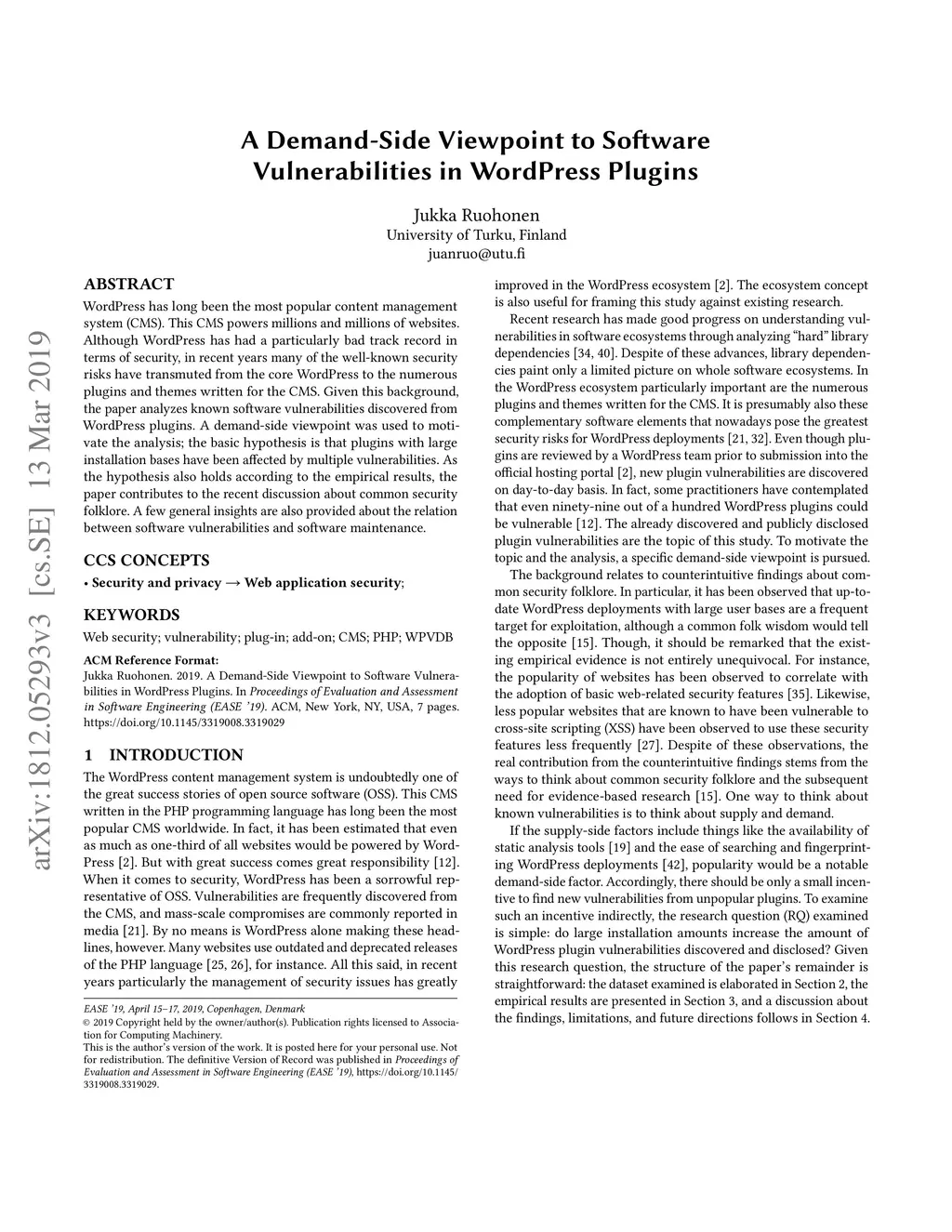 WordPress has long been the most popular content management system (CMS). This CMS powers millions and millions of websites. Although WordPress has had a particularly bad track record in terms of security, in recent years many of the well-known security risks have transmuted from the core WordPress to the numerous plugins and themes written for the CMS. Given this background, the paper analyzes known software vulnerabilities discovered from WordPress plugins. A demand-side viewpoint was used to motivate the analysis; the basic hypothesis is that plugins with large installation bases have been affected by multiple vulnerabilities. As the hypothesis also holds according to the empirical results, the paper contributes to the recent discussion about common security folklore. A few general insights are also provided about the relation between software vulnerabilities and software maintenance.