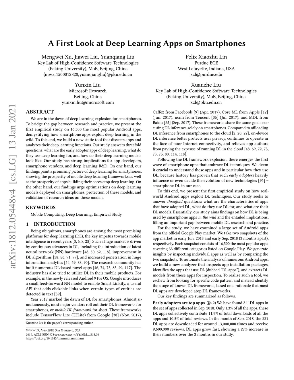We are in the dawn of deep learning explosion for smartphones. To bridge the gap between research and practice, we present the first empirical study on 16,500 the most popular Android apps, demystifying how smartphone apps exploit deep learning in the wild. To this end, we build a new static tool that dissects apps and analyzes their deep learning functions. Our study answers threefold questions: what are the early adopter apps of deep learning, what do they use deep learning for, and how do their deep learning models look like. Our study has strong implications for app developers, smartphone vendors, and deep learning R\&D. On one hand, our findings paint a promising picture of deep learning for smartphones, showing the prosperity of mobile deep learning frameworks as well as the prosperity of apps building their cores atop deep learning. On the other hand, our findings urge optimizations on deep learning models deployed on smartphones, the protection of these models, and validation of research ideas on these models.