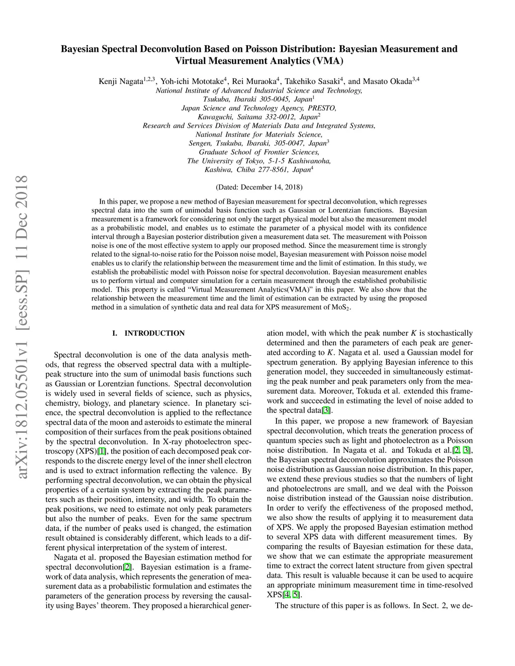 In this paper, we propose a new method of Bayesian measurement for spectral deconvolution, which regresses spectral data into the sum of unimodal basis function such as Gaussian or Lorentzian functions. Bayesian measurement is a framework for considering not only the target physical model but also the measurement model as a probabilistic model, and enables us to estimate the parameter of a physical model with its confidence interval through a Bayesian posterior distribution given a measurement data set. The measurement with Poisson noise is one of the most effective system to apply our proposed method. Since the measurement time is strongly related to the signal-to-noise ratio for the Poisson noise model, Bayesian measurement with Poisson noise model enables us to clarify the relationship between the measurement time and the limit of estimation. In this study, we establish the probabilistic model with Poisson noise for spectral deconvolution. Bayesian measurement enables us to perform virtual and computer simulation for a certain measurement through the established probabilistic model. This property is called "Virtual Measurement Analytics(VMA)" in this paper. We also show that the relationship between the measurement time and the limit of estimation can be extracted by using the proposed method in a simulation of synthetic data and real data for XPS measurement of MoS.