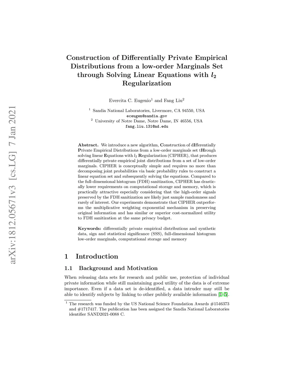 We introduce a new algorithm, Construction of dIfferentially Private Empirical Distributions from a low-order marginals set tHrough solving linear Equations with l2 Regularization (CIPHER), that produces differentially private empirical joint distributions from a set of low-order marginals. CIPHER is conceptually simple and requires no more than decomposing joint probabilities via basic probability rules to construct a linear equation set and subsequently solving the equations. Compared to the full-dimensional histogram (FDH) sanitization, CIPHER has drastic\-ally lower requirements on computational storage and memory, which is practically attractive especially considering that the high-order signals preserved by the FDH sanitization are likely just sample randomness and rarely of interest. Our experiments demonstrate that CIPHER outperforms the multiplicative weighting exponential mechanism in preserving original information and has similar or superior cost-normalized utility to FDH sanitization at the same privacy budget.