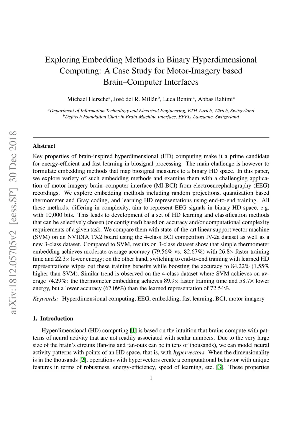 Key properties of brain-inspired hyperdimensional (HD) computing make it a prime candidate for energy-efficient and fast learning in biosignal processing. The main challenge is however to formulate embedding methods that map biosignal measures to a binary HD space. In this paper, we explore variety of such embedding methods and examine them with a challenging application of motor imagery brain-computer interface (MI-BCI) from electroencephalography (EEG) recordings. We explore embedding methods including random projections, quantization based thermometer and Gray coding, and learning HD representations using end-to-end training. All these methods, differing in complexity, aim to represent EEG signals in binary HD space, e.g. with 10,000 bits. This leads to development of a set of HD learning and classification methods that can be selectively chosen (or configured) based on accuracy and/or computational complexity requirements of a given task. We compare them with state-of-the-art linear support vector machine (SVM) on an NVIDIA TX2 board using the 4-class BCI competition IV-2a dataset as well as a new 3-class dataset. Compared to SVM, results on 3-class dataset show that simple thermometer embedding achieves moderate average accuracy (79.56% vs. 82.67%) with 26.8 faster training time and 22.3 lower energy; on the other hand, switching to end-to-end training with learned HD representations wipes out these training benefits while boosting the accuracy to 84.22% (1.55% higher than SVM). Similar trend is observed on the 4-class dataset where SVM achieves on average 74.29%: the thermometer embedding achieves 89.9 faster training time and 58.7 lower energy, but a lower accuracy (67.09%) than the learned representation of 72.54%.