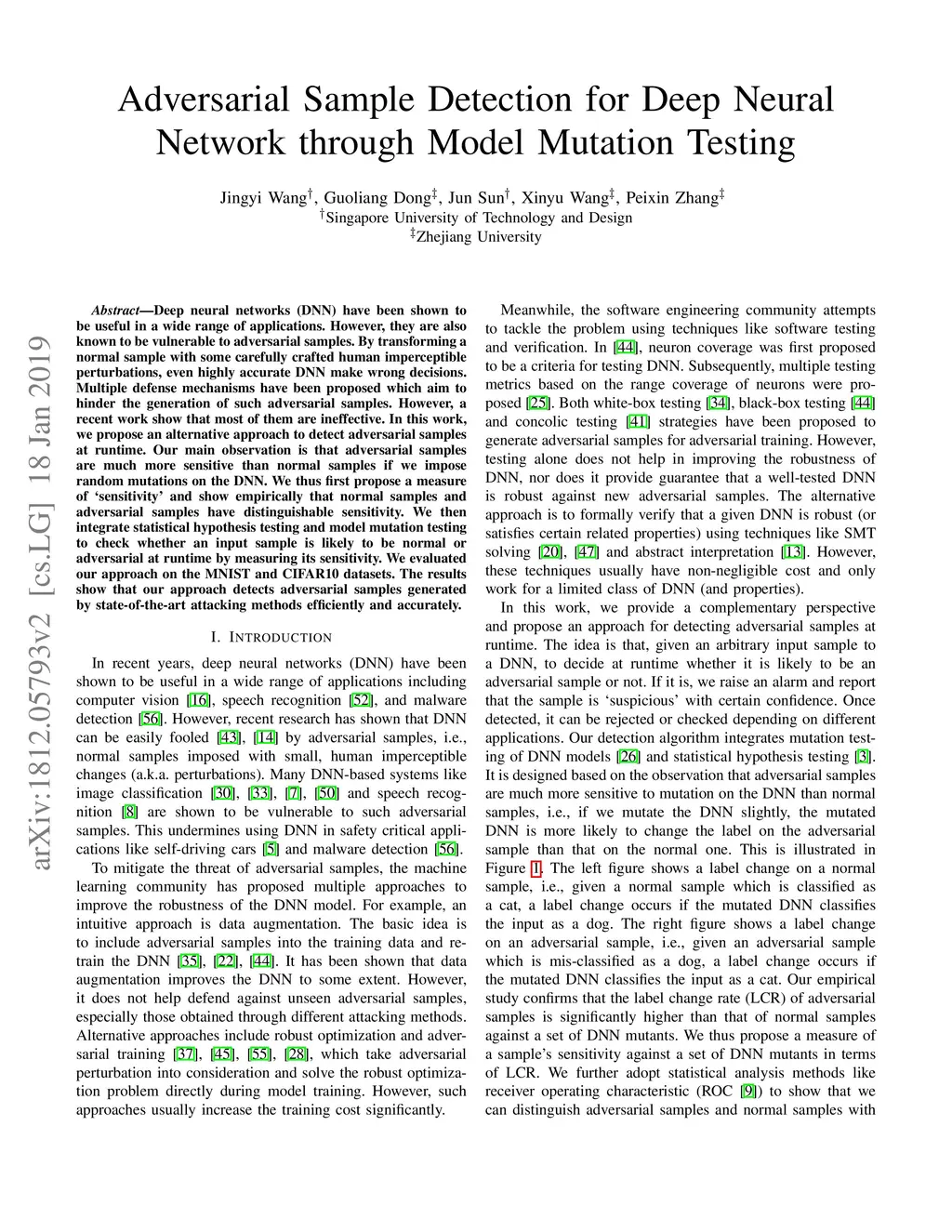 Deep neural networks (DNN) have been shown to be useful in a wide range of applications. However, they are also known to be vulnerable to adversarial samples. By transforming a normal sample with some carefully crafted human imperceptible perturbations, even highly accurate DNN make wrong decisions. Multiple defense mechanisms have been proposed which aim to hinder the generation of such adversarial samples. However, a recent work show that most of them are ineffective. In this work, we propose an alternative approach to detect adversarial samples at runtime. Our main observation is that adversarial samples are much more sensitive than normal samples if we impose random mutations on the DNN. We thus first propose a measure of `sensitivity' and show empirically that normal samples and adversarial samples have distinguishable sensitivity. We then integrate statistical hypothesis testing and model mutation testing to check whether an input sample is likely to be normal or adversarial at runtime by measuring its sensitivity. We evaluated our approach on the MNIST and CIFAR10 datasets. The results show that our approach detects adversarial samples generated by state-of-the-art attacking methods efficiently and accurately.