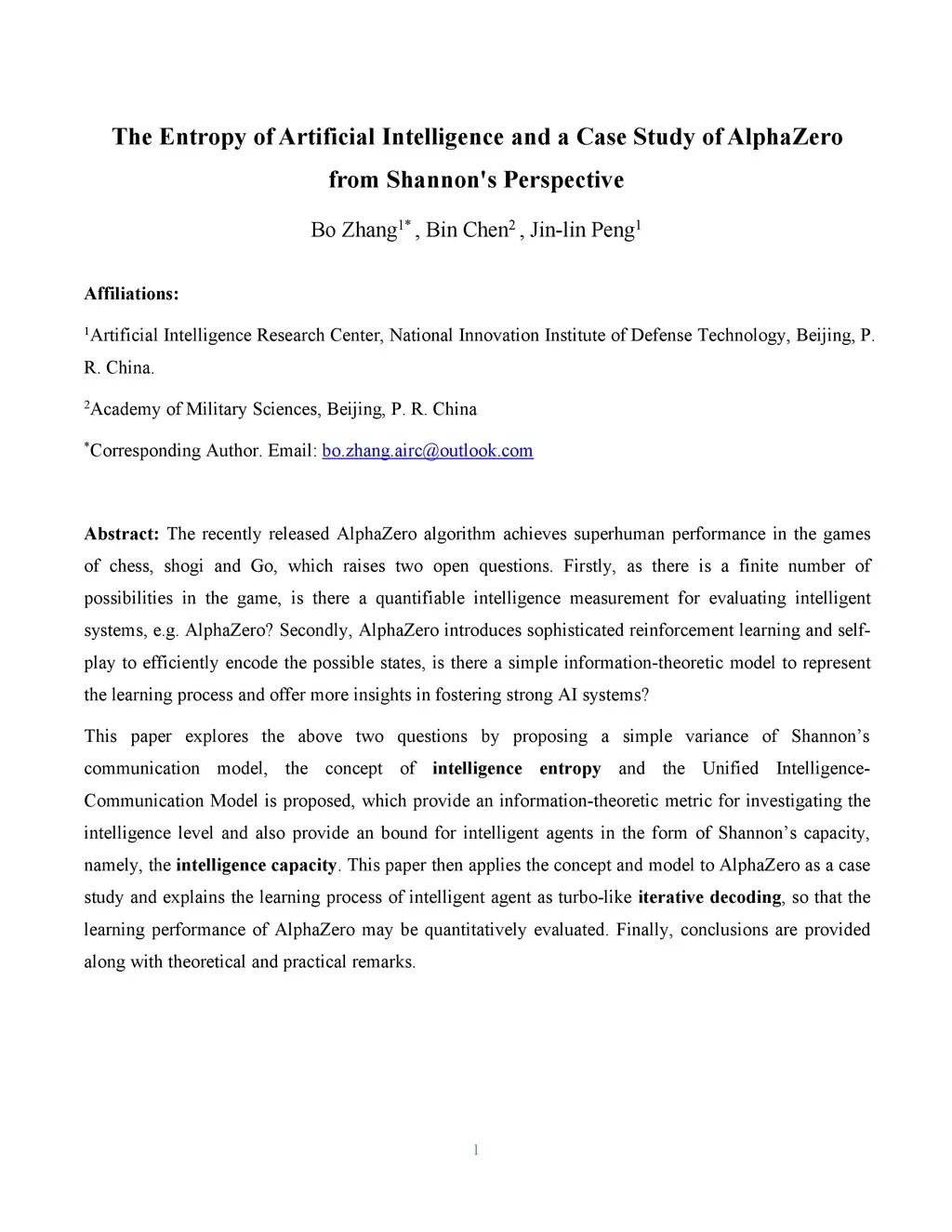 The Entropy of Artificial Intelligence and a Case Study of AlphaZero