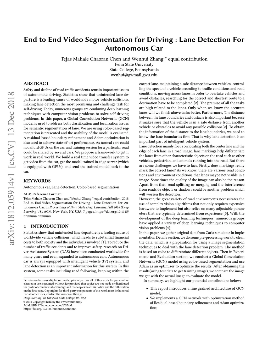 Safety and decline of road traffic accidents remain important issues of autonomous driving. Statistics show that unintended lane departure is a leading cause of worldwide motor vehicle collisions, making lane detection the most promising and challenge task for self-driving. Today, numerous groups are combining deep learning techniques with computer vision problems to solve self-driving problems. In this paper, a Global Convolution Networks (GCN) model is used to address both classification and localization issues for semantic segmentation of lane. We are using color-based segmentation is presented and the usability of the model is evaluated. A residual-based boundary refinement and Adam optimization is also used to achieve state-of-art performance. As normal cars could not afford GPUs on the car, and training session for a particular road could be shared by several cars. We propose a framework to get it work in real world. We build a real time video transfer system to get video from the car, get the model trained in edge server (which is equipped with GPUs), and send the trained model back to the car.