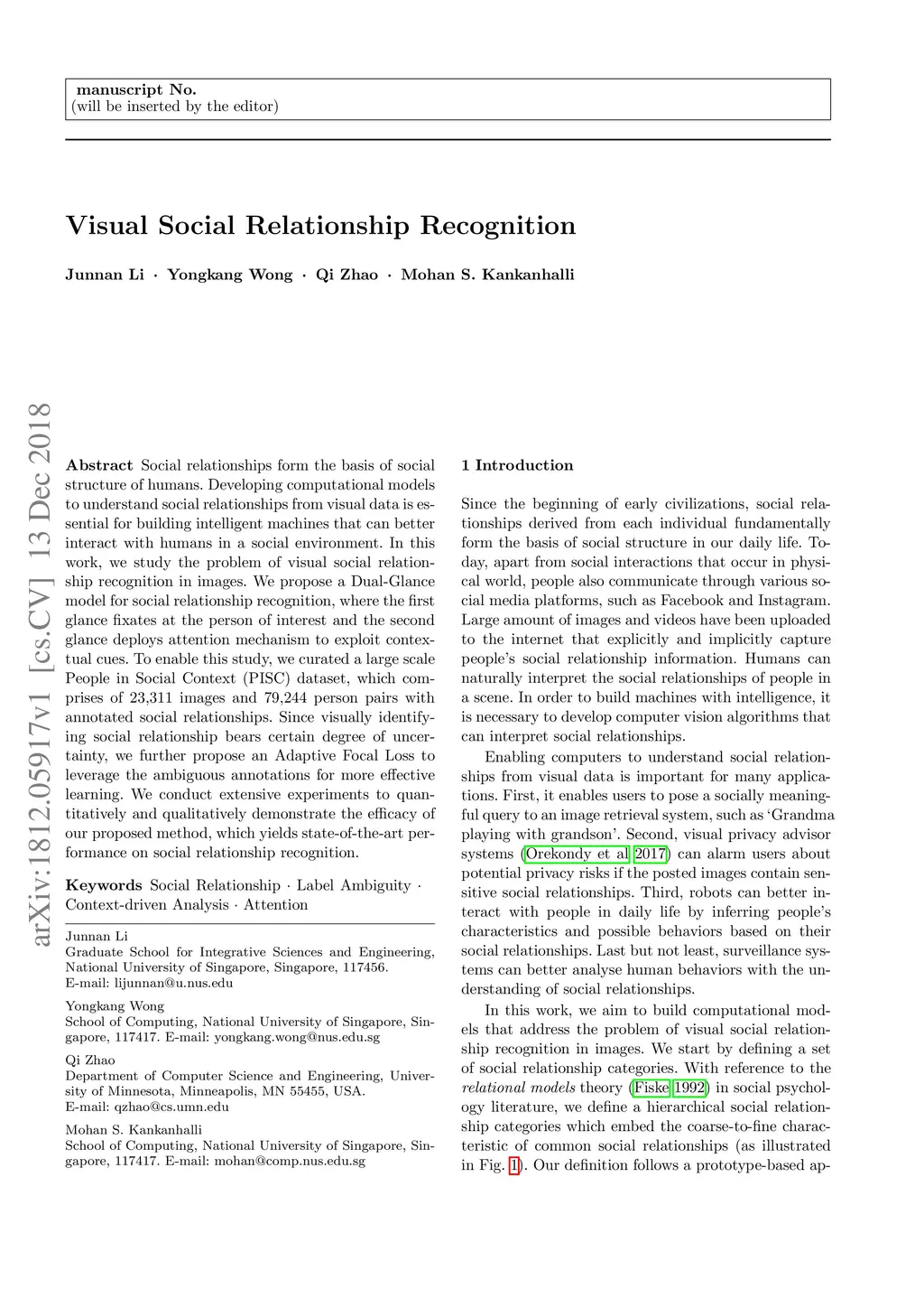 Social relationships form the basis of social structure of humans. Developing computational models to understand social relationships from visual data is essential for building intelligent machines that can better interact with humans in a social environment. In this work, we study the problem of visual social relationship recognition in images. We propose a Dual-Glance model for social relationship recognition, where the first glance fixates at the person of interest and the second glance deploys attention mechanism to exploit contextual cues. To enable this study, we curated a large scale People in Social Context (PISC) dataset, which comprises of 23,311 images and 79,244 person pairs with annotated social relationships. Since visually identifying social relationship bears certain degree of uncertainty, we further propose an Adaptive Focal Loss to leverage the ambiguous annotations for more effective learning. We conduct extensive experiments to quantitatively and qualitatively demonstrate the efficacy of our proposed method, which yields state-of-the-art performance on social relationship recognition.