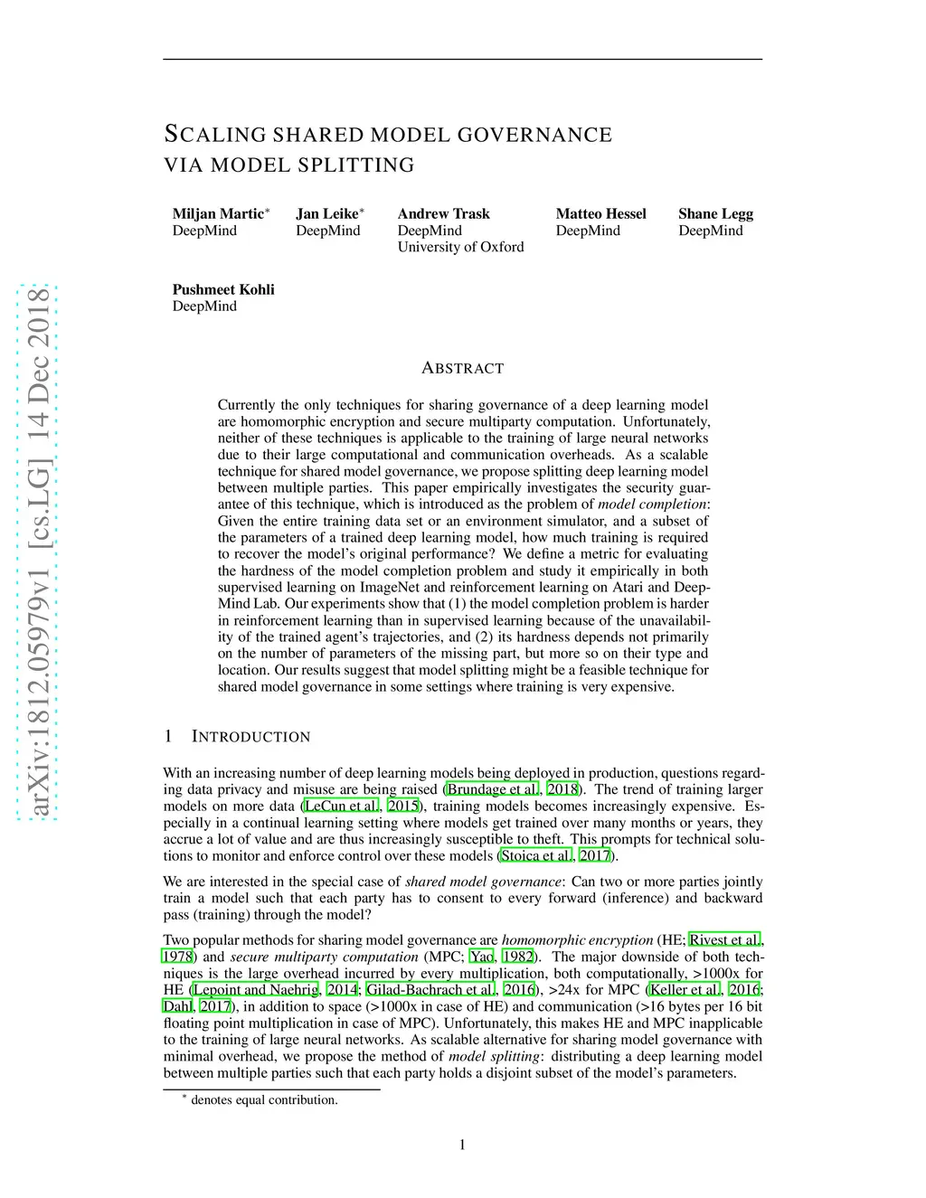 Currently the only techniques for sharing governance of a deep learning model are homomorphic encryption and secure multiparty computation. Unfortunately, neither of these techniques is applicable to the training of large neural networks due to their large computational and communication overheads. As a scalable technique for shared model governance, we propose splitting deep learning model between multiple parties. This paper empirically investigates the security guarantee of this technique, which is introduced as the problem of model completion: Given the entire training data set or an environment simulator, and a subset of the parameters of a trained deep learning model, how much training is required to recover the model's original performance? We define a metric for evaluating the hardness of the model completion problem and study it empirically in both supervised learning on ImageNet and reinforcement learning on Atari and DeepMind~Lab. Our experiments show that (1) the model completion problem is harder in reinforcement learning than in supervised learning because of the unavailability of the trained agent's trajectories, and (2) its hardness depends not primarily on the number of parameters of the missing part, but more so on their type and location. Our results suggest that model splitting might be a feasible technique for shared model governance in some settings where training is very expensive.