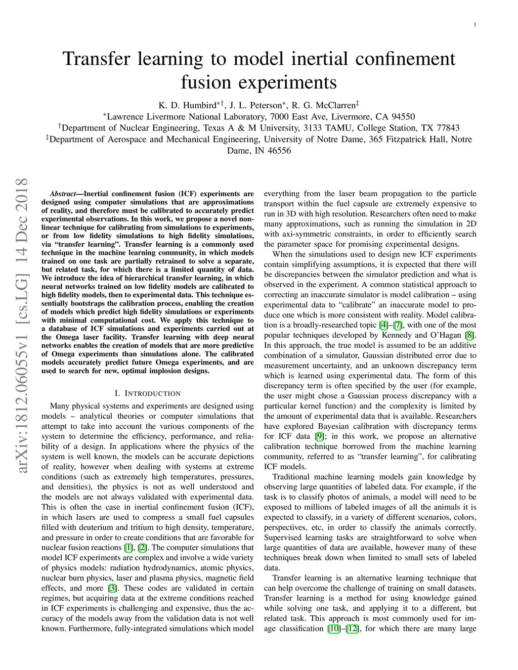 Inertial confinement fusion (ICF) experiments are designed using computer simulations that are approximations of reality, and therefore must be calibrated to accurately predict experimental observations. In this work, we propose a novel nonlinear technique for calibrating from simulations to experiments, or from low fidelity simulations to high fidelity simulations, via "transfer learning". Transfer learning is a commonly used technique in the machine learning community, in which models trained on one task are partially retrained to solve a separate, but related task, for which there is a limited quantity of data. We introduce the idea of hierarchical transfer learning, in which neural networks trained on low fidelity models are calibrated to high fidelity models, then to experimental data. This technique essentially bootstraps the calibration process, enabling the creation of models which predict high fidelity simulations or experiments with minimal computational cost. We apply this technique to a database of ICF simulations and experiments carried out at the Omega laser facility. Transfer learning with deep neural networks enables the creation of models that are more predictive of Omega experiments than simulations alone. The calibrated models accurately predict future Omega experiments, and are used to search for new, optimal implosion designs.