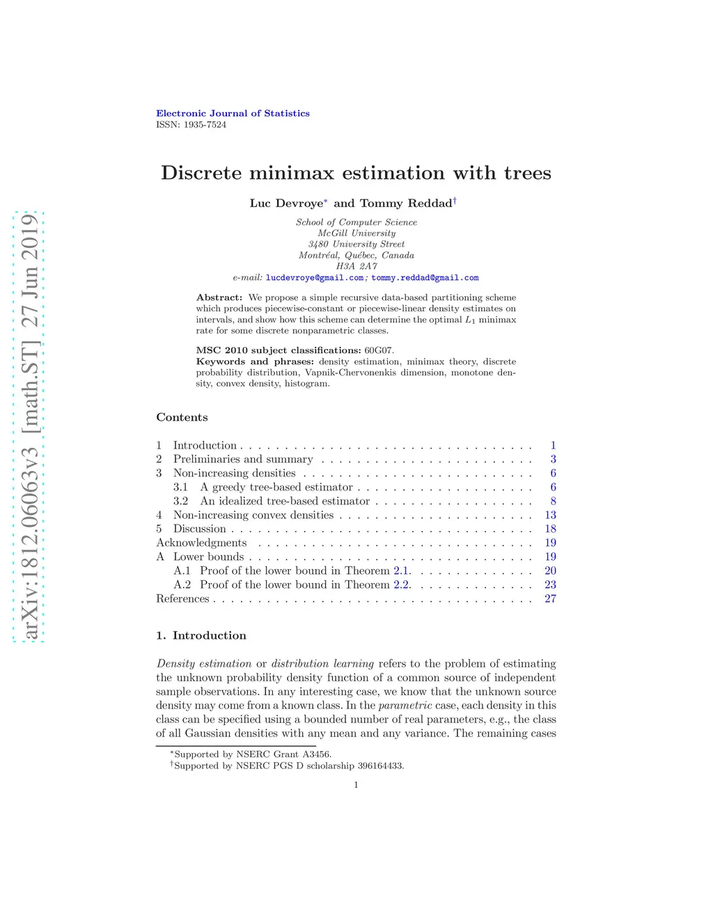 We propose a simple recursive data-based partitioning scheme which produces piecewise-constant or piecewise-linear density estimates on intervals, and show how this scheme can determine the optimal minimax rate for some discrete nonparametric classes.