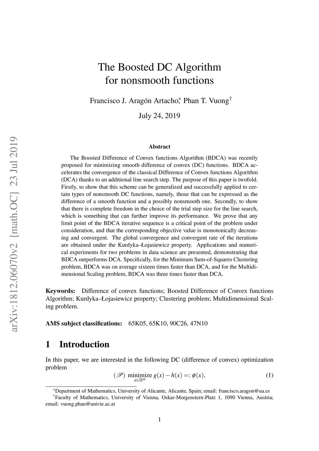 The Boosted Difference of Convex functions Algorithm (BDCA) was recently proposed for minimizing smooth difference of convex (DC) functions. BDCA accelerates the convergence of the classical Difference of Convex functions Algorithm (DCA) thanks to an additional line search step. The purpose of this paper is twofold. Firstly, to show that this scheme can be generalized and successfully applied to certain types of nonsmooth DC functions, namely, those that can be expressed as the difference of a smooth function and a possibly nonsmooth one. Secondly, to show that there is complete freedom in the choice of the trial step size for the line search, which is something that can further improve its performance. We prove that any limit point of the BDCA iterative sequence is a critical point of the problem under consideration, and that the corresponding objective value is monotonically decreasing and convergent. The global convergence and convergent rate of the iterations are obtained under the Kurdyka-Lojasiewicz property. Applications and numerical experiments for two problems in data science are presented, demonstrating that BDCA outperforms DCA. Specifically, for the Minimum Sum-of-Squares Clustering problem, BDCA was on average sixteen times faster than DCA, and for the Multidimensional Scaling problem, BDCA was three times faster than DCA.