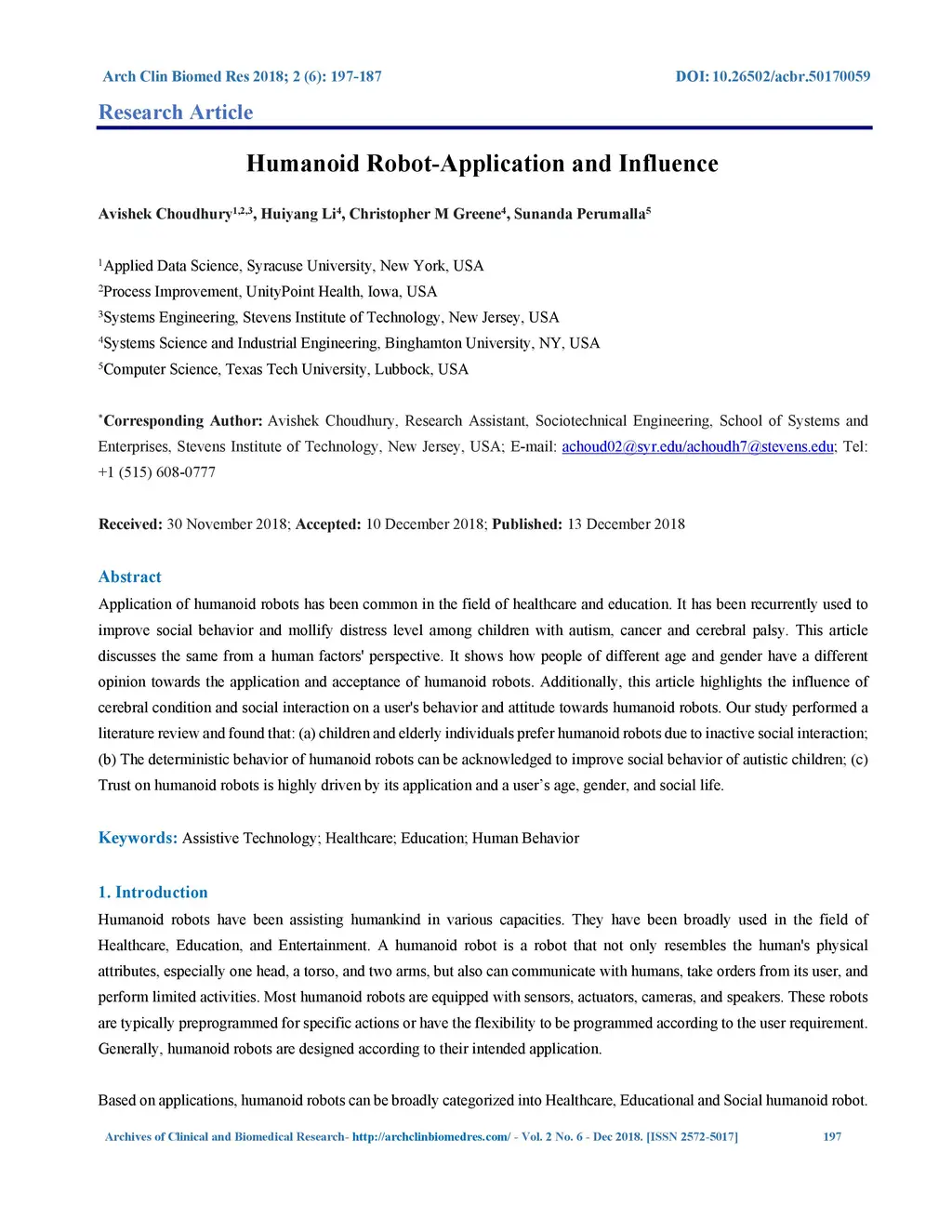 Application of humanoid robots has been common in the field of healthcare and education. It has been recurrently used to improve social behavior and mollify distress level among children with autism, cancer and cerebral palsy. This article discusses the same from a human factors perspective. It shows how people of different age and gender have a different opinion towards the application and acceptance of humanoid robots. Additionally, this article highlights the influence of cerebral condition and social interaction on a user behavior and attitude towards humanoid robots. Our study performed a literature review and found that (a) children and elderly individuals prefer humanoid robots due to inactive social interaction, (b) The deterministic behavior of humanoid robots can be acknowledged to improve social behavior of autistic children, (c) Trust on humanoid robots is highly driven by its application and a user age, gender, and social life.