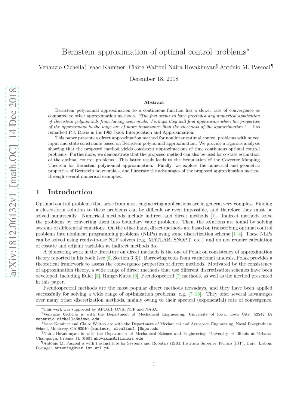 Bernstein polynomial approximation to a continuous function has a slower rate of convergence as compared to other approximation methods. "The fact seems to have precluded any numerical application of Bernstein polynomials from having been made. Perhaps they will find application when the properties of the approximant in the large are of more importance than the closeness of the approximation." -- has remarked P.J. Davis in his 1963 book Interpolation and Approximation. This paper presents a direct approximation method for nonlinear optimal control problems with mixed input and state constraints based on Bernstein polynomial approximation. We provide a rigorous analysis showing that the proposed method yields consistent approximations of time continuous optimal control problems. Furthermore, we demonstrate that the proposed method can also be used for costate estimation of the optimal control problems. This latter result leads to the formulation of the Covector Mapping Theorem for Bernstein polynomial approximation. Finally, we explore the numerical and geometric properties of Bernstein polynomials, and illustrate the advantages of the proposed approximation method through several numerical examples.