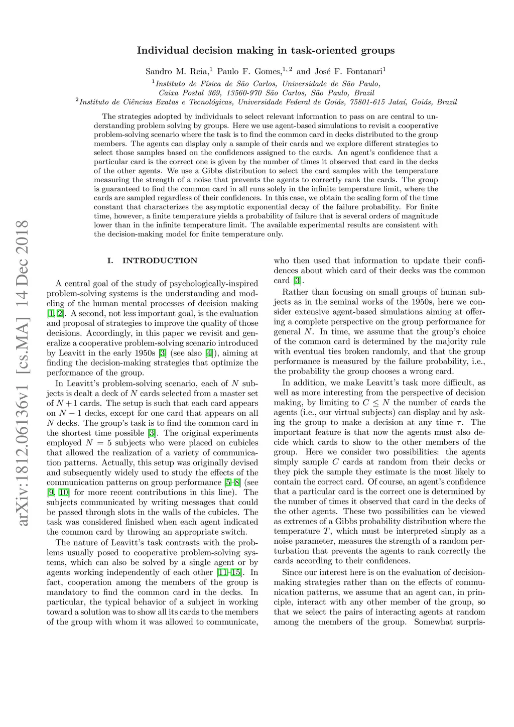 The strategies adopted by individuals to select relevant information to pass on are central to understanding problem solving by groups. Here we use agent-based simulations to revisit a cooperative problem-solving scenario where the task is to find the common card in decks distributed to the group members. The agents can display only a sample of their cards and we explore different strategies to select those samples based on the confidences assigned to the cards. An agent's confidence that a particular card is the correct one is given by the number of times it observed that card in the decks of the other agents. We use a Gibbs distribution to select the card samples with the temperature measuring the strength of a noise that prevents the agents to correctly rank the cards. The group is guaranteed to find the common card in all runs solely in the infinite temperature limit, where the cards are sampled regardless of their confidences. In this case, we obtain the scaling form of the time constant that characterizes the asymptotic exponential decay of the failure probability. For finite time, however, a finite temperature yields a probability of failure that is several orders of magnitude lower than in the infinite temperature limit. The available experimental results are consistent with the decision-making model for finite temperature only.