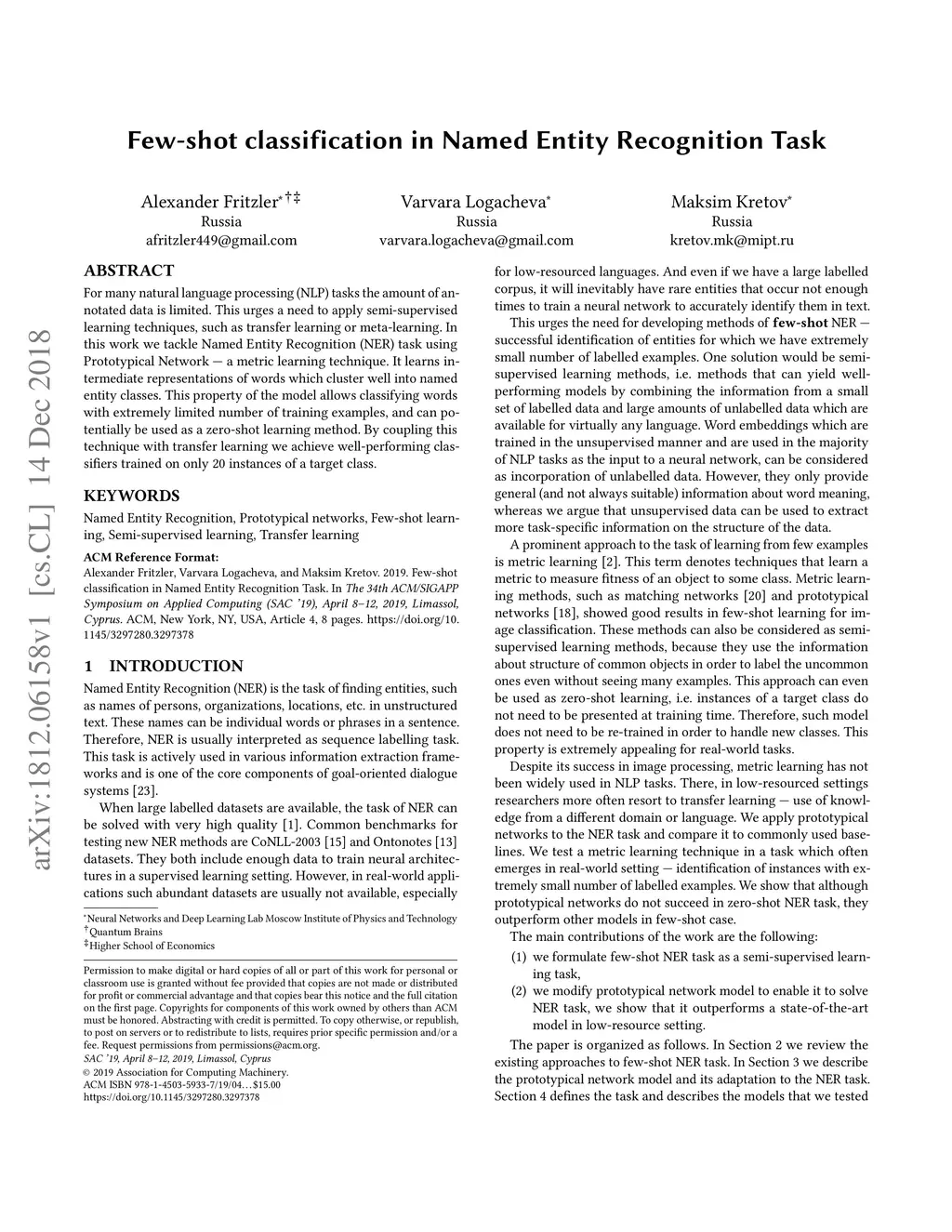For many natural language processing (NLP) tasks the amount of annotated data is limited. This urges a need to apply semi-supervised learning techniques, such as transfer learning or meta-learning. In this work we tackle Named Entity Recognition (NER) task using Prototypical Network - a metric learning technique. It learns intermediate representations of words which cluster well into named entity classes. This property of the model allows classifying words with extremely limited number of training examples, and can potentially be used as a zero-shot learning method. By coupling this technique with transfer learning we achieve well-performing classifiers trained on only 20 instances of a target class.