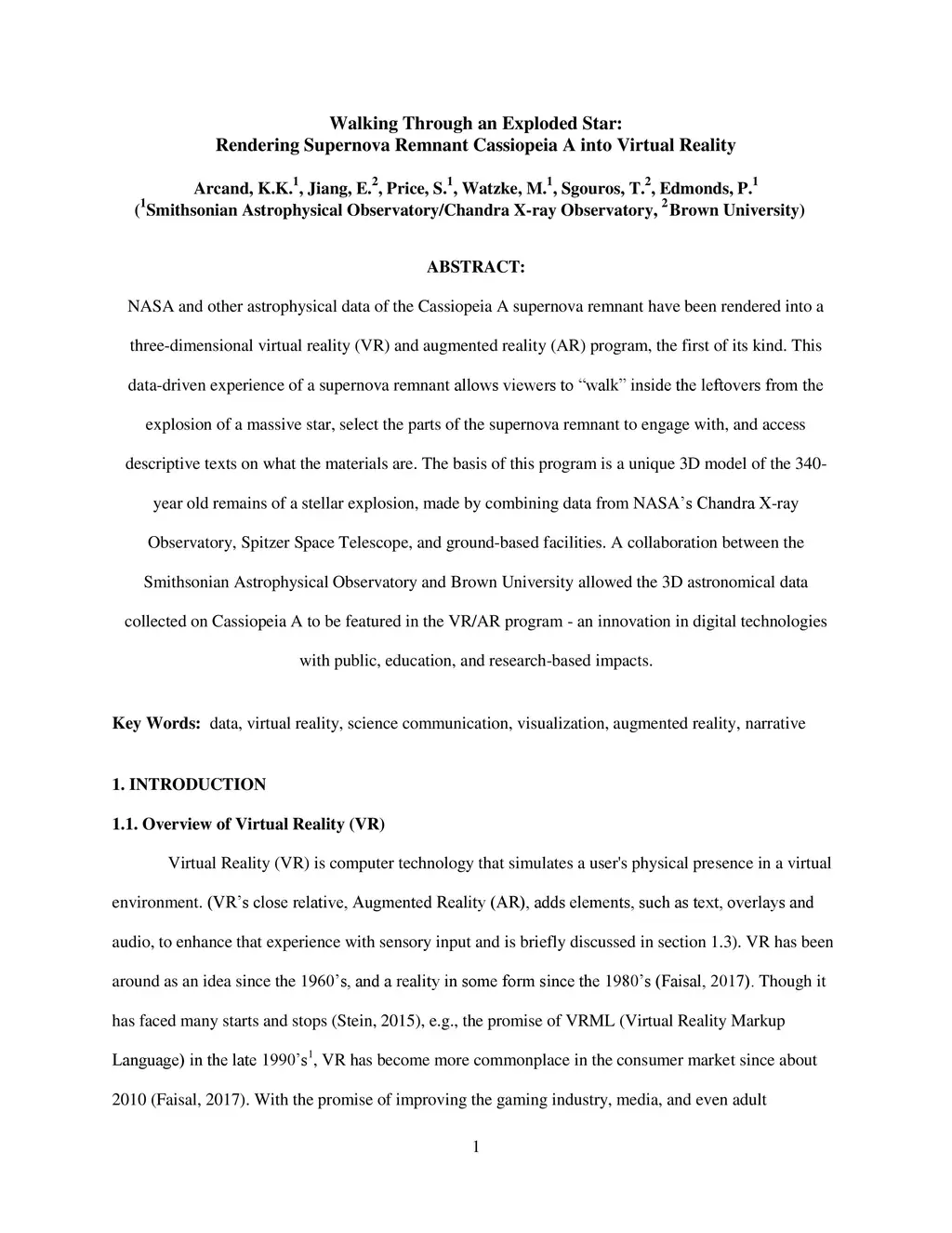 NASA and other astrophysical data of the Cassiopeia A supernova remnant have been rendered into a three-dimensional virtual reality (VR) and augmented reality (AR) program, the first of its kind. This data-driven experience of a supernova remnant allows viewers to walk inside the leftovers from the explosion of a massive star, select the parts of the supernova remnant to engage with, and access descriptive texts on what the materials are. The basis of this program is a unique 3D model of the 340-year old remains of a stellar explosion, made by combining data from the NASA Chandra X-ray Observatory, Spitzer Space Telescope, and ground-based facilities. A collaboration between the Smithsonian Astrophysical Observatory and Brown University allowed the 3D astronomical data collected on Cassiopeia A to be featured in the VR/AR program, which is an innovation in digital technologies with public, education, and research-based impacts.