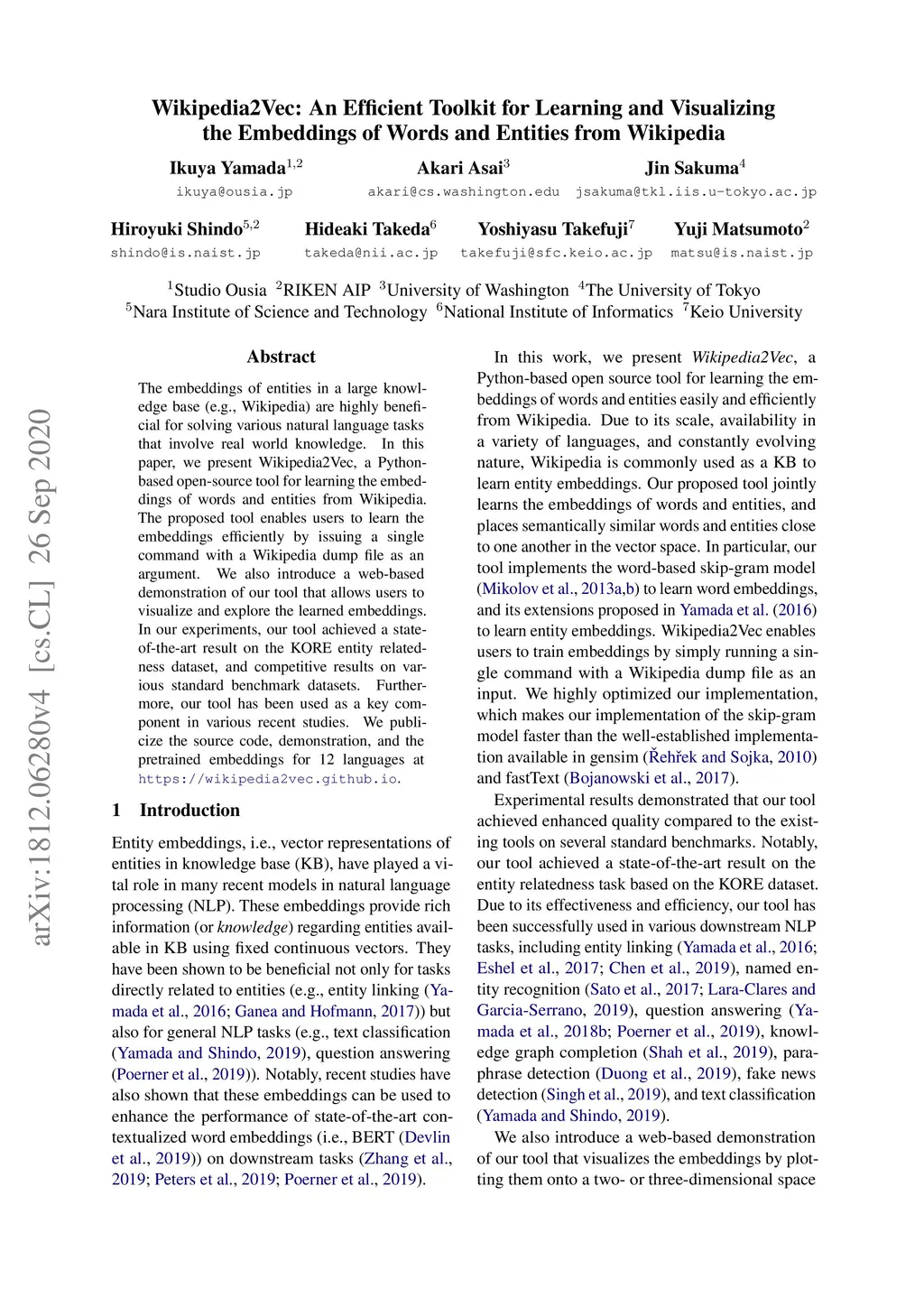 Wikipedia2Vec: An Efficient Toolkit for Learning and Visualizing the