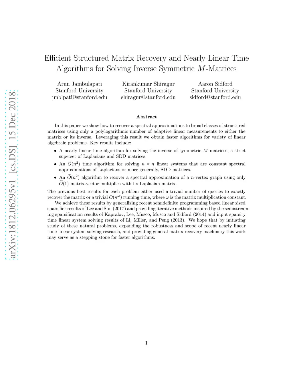 In this paper we show how to recover a spectral approximations to broad classes of structured matrices using only a polylogarithmic number of adaptive linear measurements to either the matrix or its inverse. Leveraging this result we obtain faster algorithms for variety of linear algebraic problems. Key results include: A nearly linear time algorithm for solving the inverse of symmetric -matrices, a strict superset of Laplacians and SDD matrices. An time algorithm for solving linear systems that are constant spectral approximations of Laplacians or more generally, SDD matrices. An algorithm to recover a spectral approximation of a -vertex graph using only matrix-vector multiplies with its Laplacian matrix. The previous best results for each problem either used a trivial number of queries to exactly recover the matrix or a trivial running time, where is the matrix multiplication constant. We achieve these results by generalizing recent semidefinite programming based linear sized sparsifier results of Lee and Sun (2017) and providing iterative methods inspired by the semistreaming sparsification results of Kapralov, Lee, Musco, Musco and Sidford (2014) and input sparsity time linear system solving results of Li, Miller, and Peng (2013). We hope that by initiating study of these natural problems, expanding the robustness and scope of recent nearly linear time linear system solving research, and providing general matrix recovery machinery this work may serve as a stepping stone for faster algorithms.