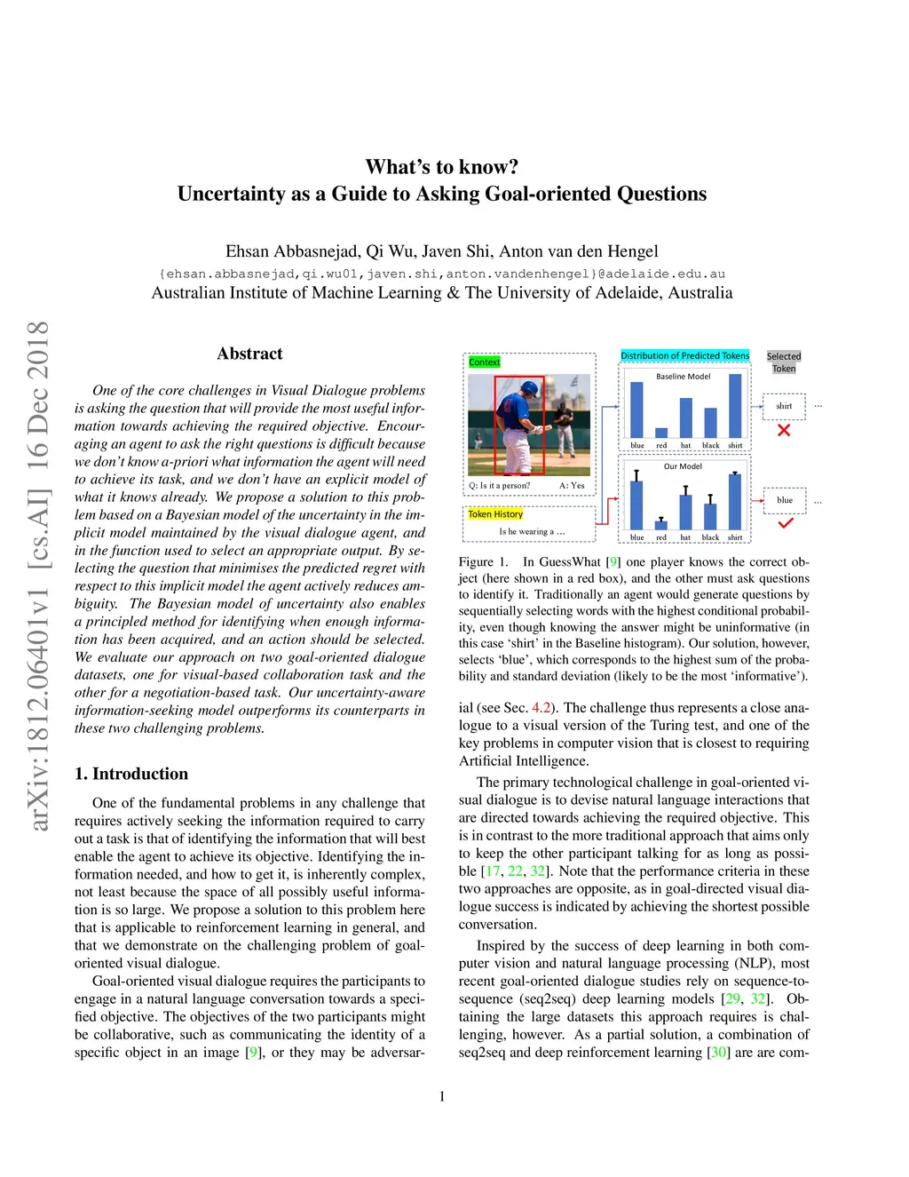 One of the core challenges in Visual Dialogue problems is asking the question that will provide the most useful information towards achieving the required objective. Encouraging an agent to ask the right questions is difficult because we don't know a-priori what information the agent will need to achieve its task, and we don't have an explicit model of what it knows already. We propose a solution to this problem based on a Bayesian model of the uncertainty in the implicit model maintained by the visual dialogue agent, and in the function used to select an appropriate output. By selecting the question that minimises the predicted regret with respect to this implicit model the agent actively reduces ambiguity. The Bayesian model of uncertainty also enables a principled method for identifying when enough information has been acquired, and an action should be selected. We evaluate our approach on two goal-oriented dialogue datasets, one for visual-based collaboration task and the other for a negotiation-based task. Our uncertainty-aware information-seeking model outperforms its counterparts in these two challenging problems.