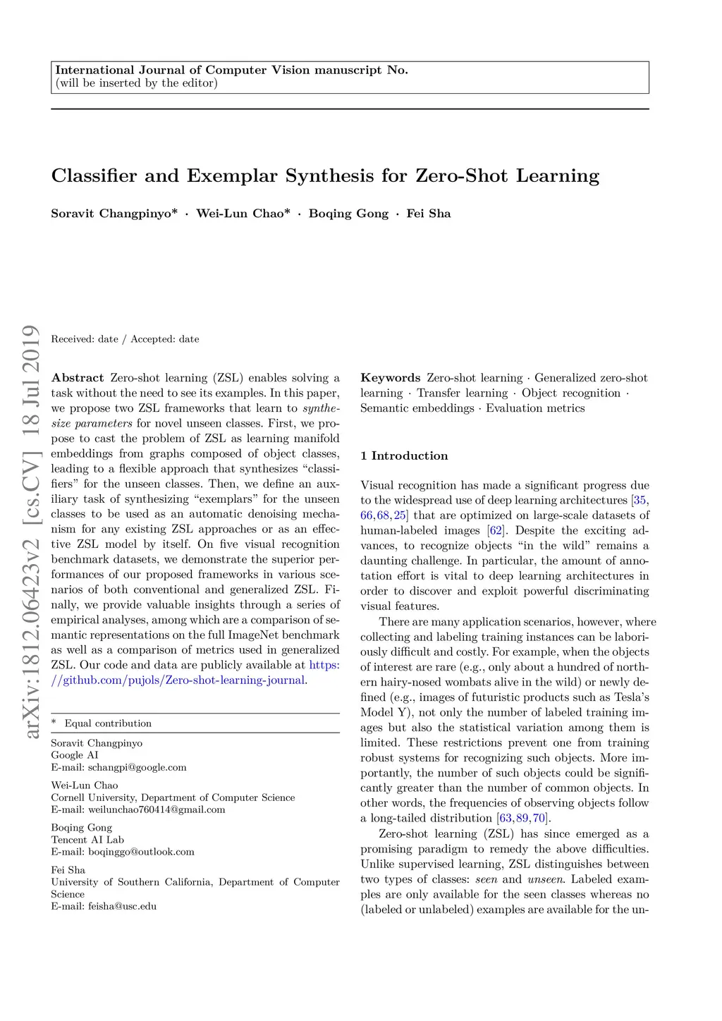 Classifier and Exemplar Synthesis for Zero-Shot Learning