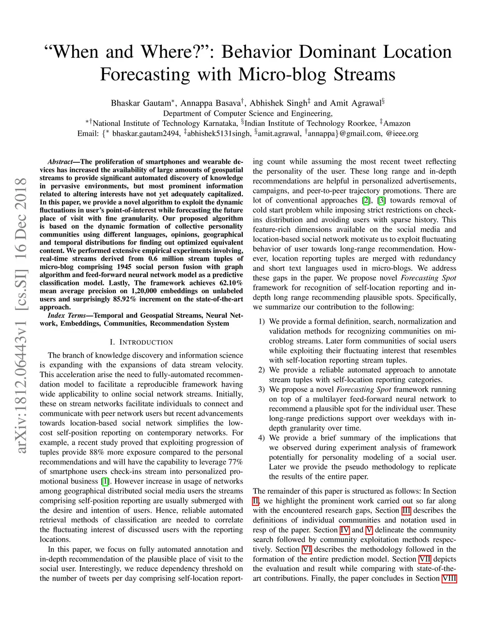 The proliferation of smartphones and wearable devices has increased the availability of large amounts of geospatial streams to provide significant automated discovery of knowledge in pervasive environments, but most prominent information related to altering interests have not yet adequately capitalized. In this paper, we provide a novel algorithm to exploit the dynamic fluctuations in user's point-of-interest while forecasting the future place of visit with fine granularity. Our proposed algorithm is based on the dynamic formation of collective personality communities using different languages, opinions, geographical and temporal distributions for finding out optimized equivalent content. We performed extensive empirical experiments involving, real-time streams derived from 0.6 million stream tuples of micro-blog comprising 1945 social person fusion with graph algorithm and feed-forward neural network model as a predictive classification model. Lastly, The framework achieves 62.10% mean average precision on 1,20,000 embeddings on unlabeled users and surprisingly 85.92% increment on the state-of-the-art approach.