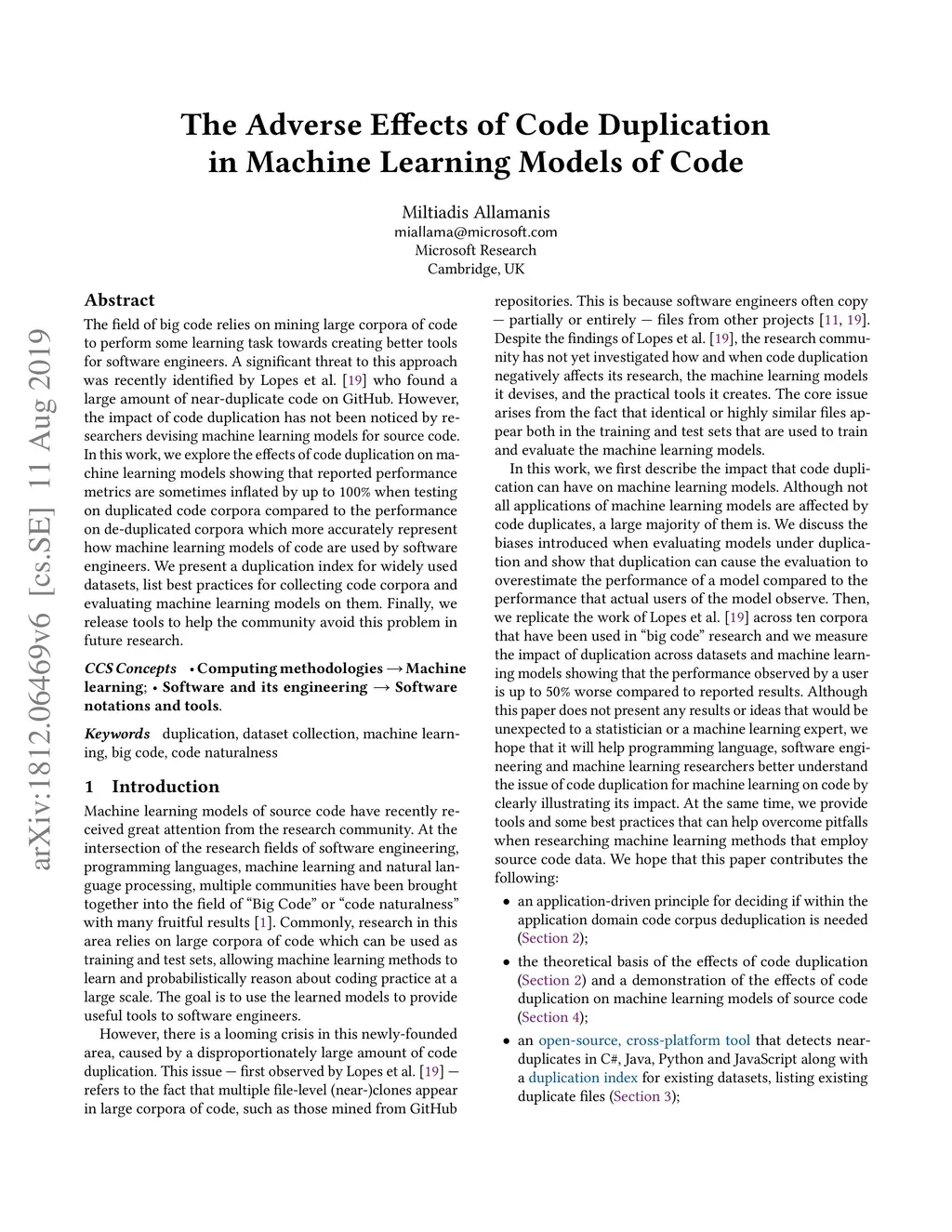 The field of big code relies on mining large corpora of code to perform some learning task. A significant threat to this approach has been recently identified by Lopes et al. (2017) who found a large amount of near-duplicate code on GitHub. However, the impact of code duplication has not been noticed by researchers devising machine learning models for source code. In this work, we explore the effects of code duplication on machine learning models showing that reported performance metrics are sometimes inflated by up to 100% when testing on duplicated code corpora compared to the performance on de-duplicated corpora which more accurately represent how machine learning models of code are used by software engineers. We present a duplication index for widely used datasets, list best practices for collecting code corpora and evaluating machine learning models on them. Finally, we release tools to help the community avoid this problem in future research.
