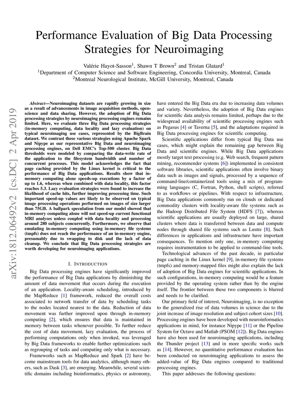 Neuroimaging datasets are rapidly growing in size as a result of advancements in image acquisition methods, open-science and data sharing. However, the adoption of Big Data processing strategies by neuroimaging processing engines remains limited. Here, we evaluate three Big Data processing strategies (in-memory computing, data locality and lazy evaluation) on typical neuroimaging use cases, represented by the BigBrain dataset. We contrast these various strategies using Apache Spark and Nipype as our representative Big Data and neuroimaging processing engines, on Dell EMC's Top-500 cluster. Big Data thresholds were modelled by comparing the data-write rate of the application to the filesystem bandwidth and number of concurrent processes. This model acknowledges the fact that page caching provided by the Linux kernel is critical to the performance of Big Data applications. Results show that in-memory computing alone speeds-up executions by a factor of up to 1.6, whereas when combined with data locality, this factor reaches 5.3. Lazy evaluation strategies were found to increase the likelihood of cache hits, further improving processing time. Such important speed-up values are likely to be observed on typical image processing operations performed on images of size larger than 75GB. A ballpark speculation from our model showed that in-memory computing alone will not speed-up current functional MRI analyses unless coupled with data locality and processing around 280 subjects concurrently. Furthermore, we observe that emulating in-memory computing using in-memory file systems (tmpfs) does not reach the performance of an in-memory engine, presumably due to swapping to disk and the lack of data cleanup. We conclude that Big Data processing strategies are worth developing for neuroimaging applications.
