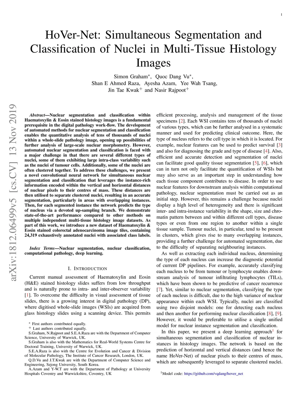 HoVer-Net: Simultaneous Segmentation and Classification of Nuclei in Multi-Tissue Histology Images