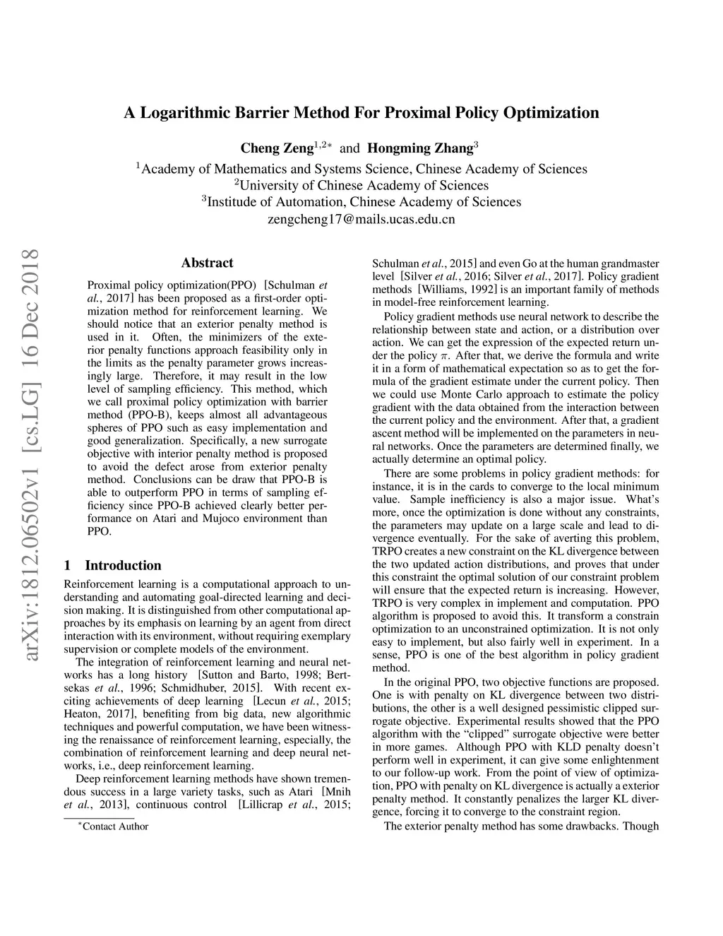 Proximal policy optimization(PPO) has been proposed as a first-order optimization method for reinforcement learning. We should notice that an exterior penalty method is used in it. Often, the minimizers of the exterior penalty functions approach feasibility only in the limits as the penalty parameter grows increasingly large. Therefore, it may result in the low level of sampling efficiency. This method, which we call proximal policy optimization with barrier method (PPO-B), keeps almost all advantageous spheres of PPO such as easy implementation and good generalization. Specifically, a new surrogate objective with interior penalty method is proposed to avoid the defect arose from exterior penalty method. Conclusions can be draw that PPO-B is able to outperform PPO in terms of sampling efficiency since PPO-B achieved clearly better performance on Atari and Mujoco environment than PPO.