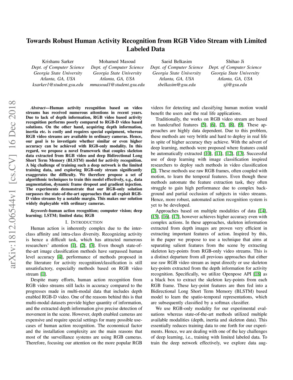 Human activity recognition based on video streams has received numerous attentions in recent years. Due to lack of depth information, RGB video based activity recognition performs poorly compared to RGB-D video based solutions. On the other hand, acquiring depth information, inertia etc. is costly and requires special equipment, whereas RGB video streams are available in ordinary cameras. Hence, our goal is to investigate whether similar or even higher accuracy can be achieved with RGB-only modality. In this regard, we propose a novel framework that couples skeleton data extracted from RGB video and deep Bidirectional Long Short Term Memory (BLSTM) model for activity recognition. A big challenge of training such a deep network is the limited training data, and exploring RGB-only stream significantly exaggerates the difficulty. We therefore propose a set of algorithmic techniques to train this model effectively, e.g., data augmentation, dynamic frame dropout and gradient injection. The experiments demonstrate that our RGB-only solution surpasses the state-of-the-art approaches that all exploit RGB-D video streams by a notable margin. This makes our solution widely deployable with ordinary cameras.