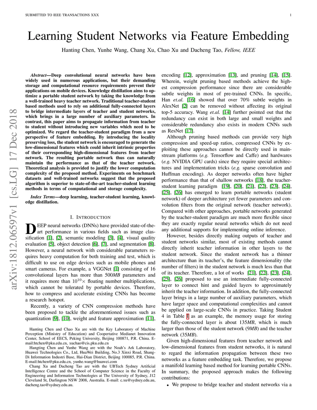 Deep convolutional neural networks have been widely used in numerous applications, but their demanding storage and computational resource requirements prevent their applications on mobile devices. Knowledge distillation aims to optimize a portable student network by taking the knowledge from a well-trained heavy teacher network. Traditional teacher-student based methods used to rely on additional fully-connected layers to bridge intermediate layers of teacher and student networks, which brings in a large number of auxiliary parameters. In contrast, this paper aims to propagate information from teacher to student without introducing new variables which need to be optimized. We regard the teacher-student paradigm from a new perspective of feature embedding. By introducing the locality preserving loss, the student network is encouraged to generate the low-dimensional features which could inherit intrinsic properties of their corresponding high-dimensional features from teacher network. The resulting portable network thus can naturally maintain the performance as that of the teacher network. Theoretical analysis is provided to justify the lower computation complexity of the proposed method. Experiments on benchmark datasets and well-trained networks suggest that the proposed algorithm is superior to state-of-the-art teacher-student learning methods in terms of computational and storage complexity.