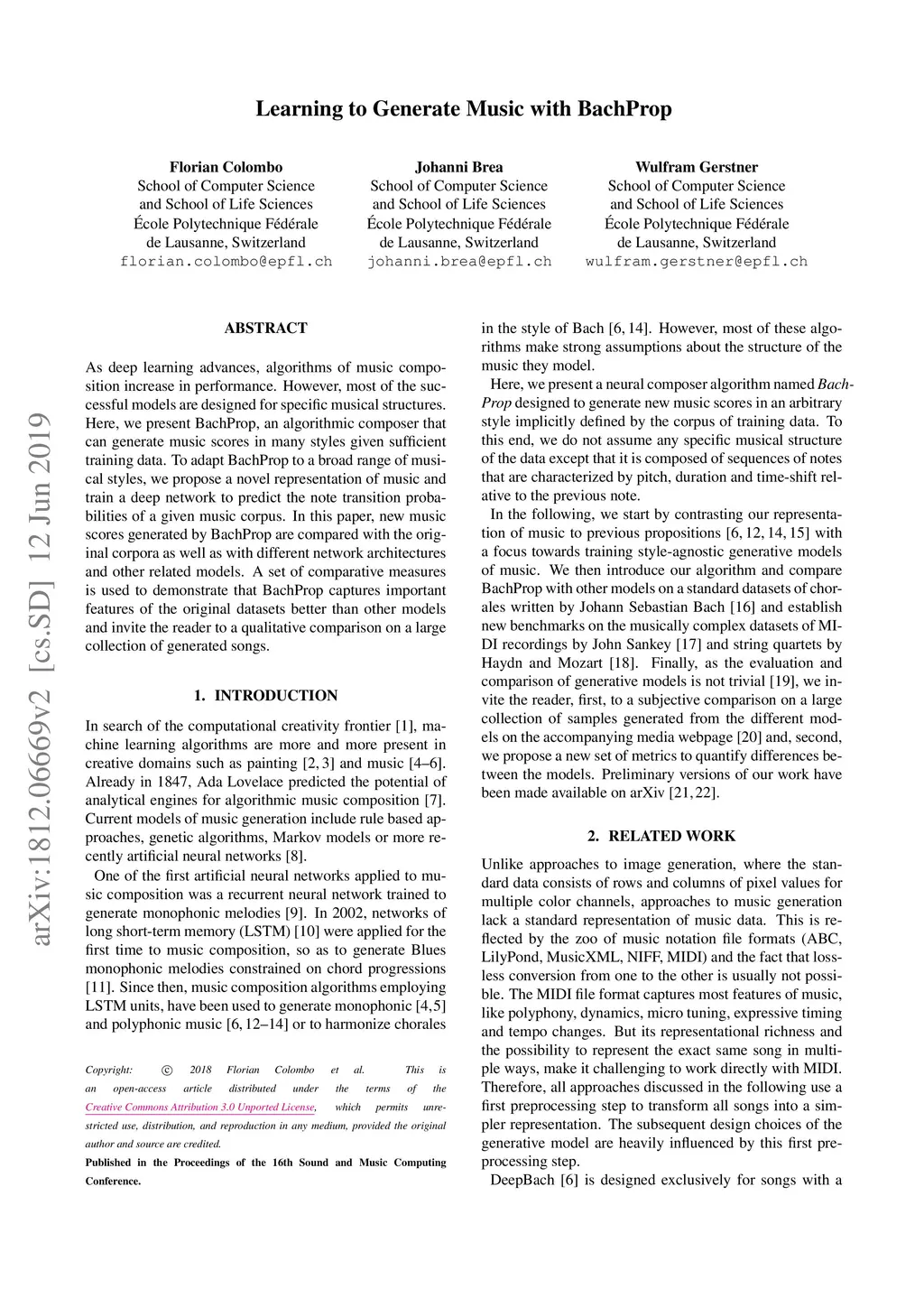As deep learning advances, algorithms of music composition increase in performance. However, most of the successful models are designed for specific musical structures. Here, we present BachProp, an algorithmic composer that can generate music scores in many styles given sufficient training data. To adapt BachProp to a broad range of musical styles, we propose a novel representation of music and train a deep network to predict the note transition probabilities of a given music corpus. In this paper, new music scores generated by BachProp are compared with the original corpora as well as with different network architectures and other related models. We show that BachProp captures important features of the original datasets better than other models and invite the reader to a qualitative comparison on a large collection of generated songs.