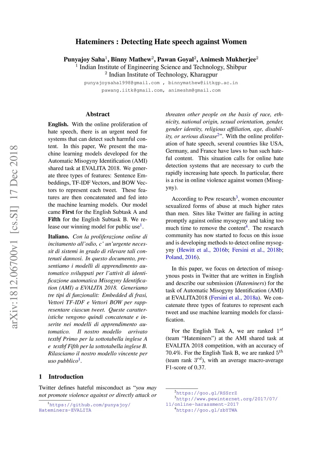 Hateminers : Detecting Hate speech against Women