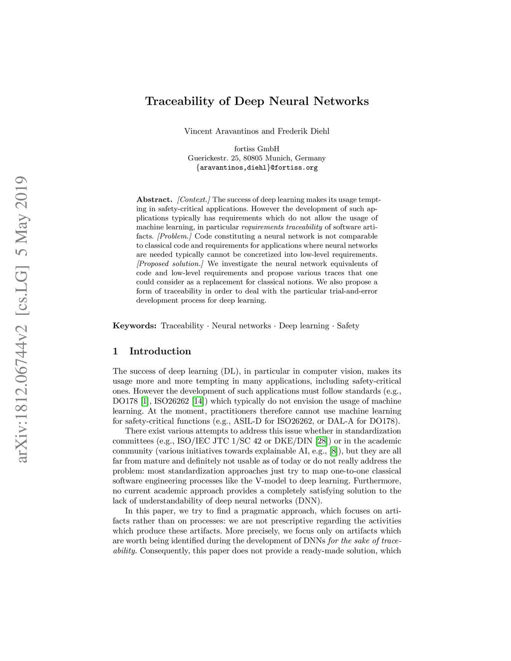 [Context.] The success of deep learning makes its usage more and more tempting in safety-critical applications. However such applications have historical standards (e.g., DO178, ISO26262) which typically do not envision the usage of machine learning. We focus in particular on \emph{requirements traceability} of software artifacts, i.e., code modules, functions, or statements (depending on the desired granularity). [Problem.] Both code and requirements are a problem when dealing with deep neural networks: code constituting the network is not comparable to classical code; furthermore, requirements for applications where neural networks are required are typically very hard to specify: even though high-level requirements can be defined, it is very hard to make such requirements concrete enough, that one can qualify them of low-level requirements. An additional problem is that deep learning is in practice very much based on trial-and-error, which makes the final result hard to explain without the previous iterations. [Proposed solution.] We investigate which artifacts could play a similar role to code or low-level requirements in neural network development and propose various traces which one could possibly consider as a replacement for classical notions. We also propose a form of traceability (and new artifacts) in order to deal with the particular trial-and-error development process for deep learning.