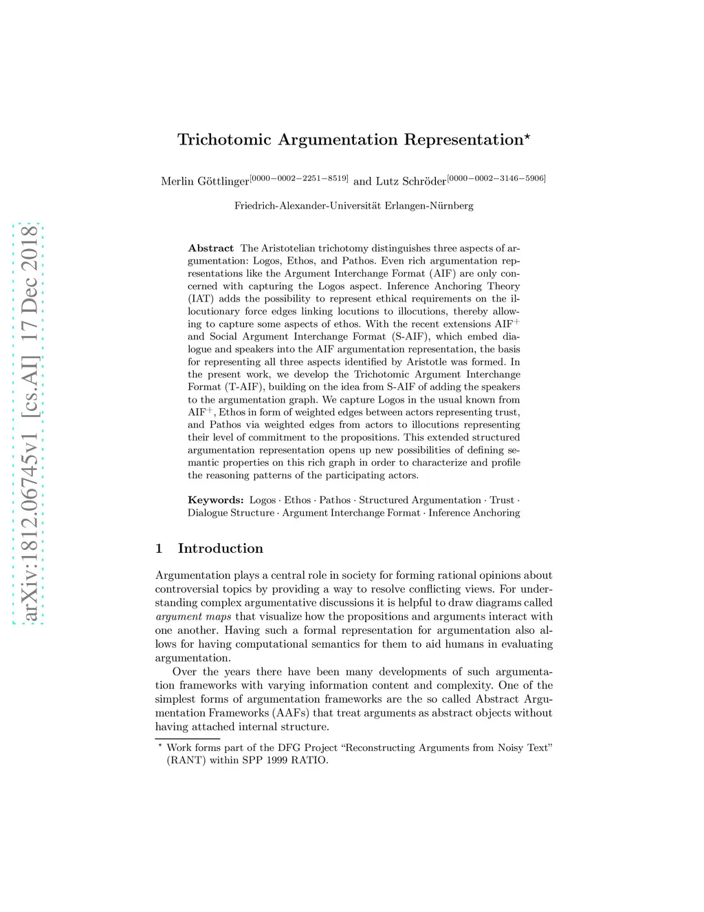 The Aristotelian trichotomy distinguishes three aspects of argumentation: Logos, Ethos, and Pathos. Even rich argumentation representations like the Argument Interchange Format (AIF) are only concerned with capturing the Logos aspect. Inference Anchoring Theory (IAT) adds the possibility to represent ethical requirements on the illocutionary force edges linking locutions to illocutions, thereby allowing to capture some aspects of ethos. With the recent extensions AIF+ and Social Argument Interchange Format (S-AIF), which embed dialogue and speakers into the AIF argumentation representation, the basis for representing all three aspects identified by Aristotle was formed. In the present work, we develop the Trichotomic Argument Interchange Format (T-AIF), building on the idea from S-AIF of adding the speakers to the argumentation graph. We capture Logos in the usual known from AIF+, Ethos in form of weighted edges between actors representing trust, and Pathos via weighted edges from actors to illocutions representing their level of commitment to the propositions. This extended structured argumentation representation opens up new possibilities of defining semantic properties on this rich graph in order to characterize and profile the reasoning patterns of the participating actors.